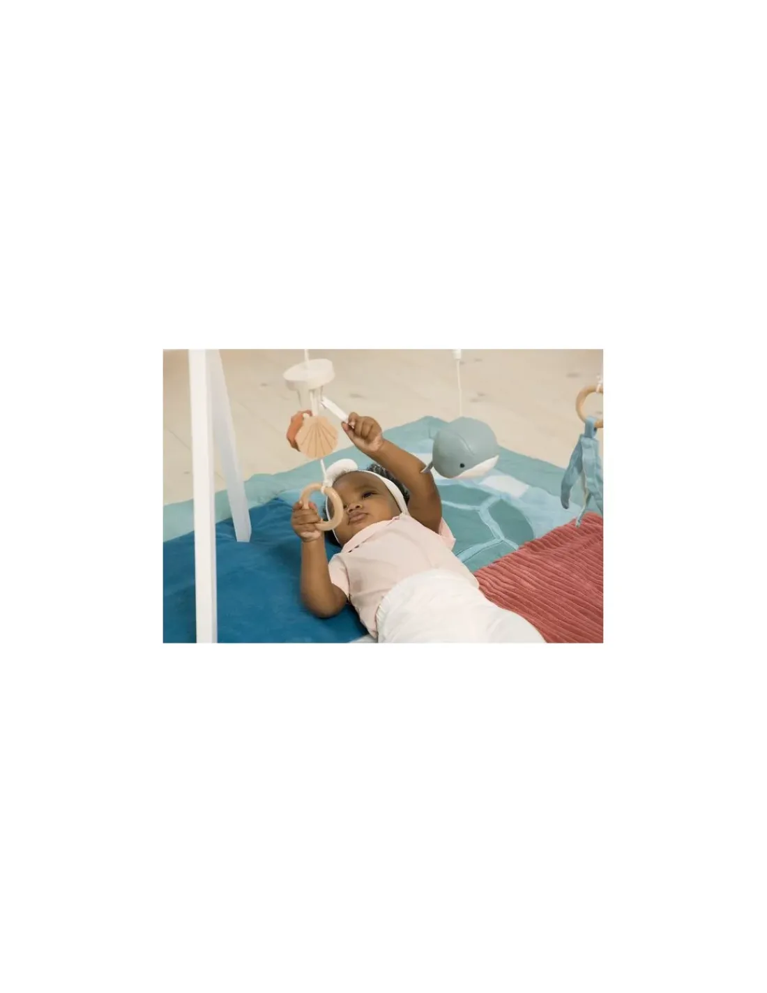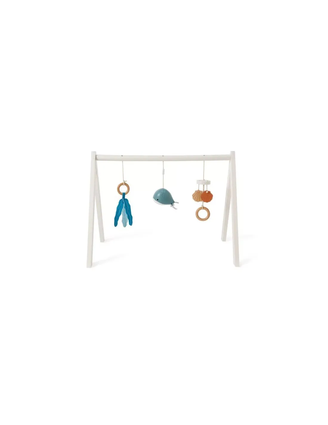 Une arche d’éveil tout en bois pour bébé, ultra-légère, au design épuré et rigolo sur le thème de l’océan. Bébé pourra s’entraîner à attraper et manipuler les éléments pour développer sa motricité fine tout en s’amusant. L’arche de jeu en bois Little Big Friends éveille les sens de bébé grâce à ses 3 adorables jouets suspendus sur le thème de l’océan: une feuille en tissu craquant, une baleine qui fait un bruit de maracas et un carillon avec 3 coquillages en bois.