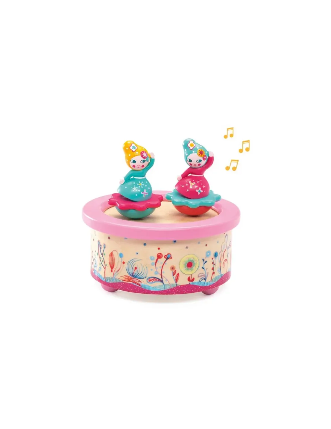 Découvrez la boite à musique « Flower Melody » de Djeco, une jolie boite à musique ronde en bois avec deux valseuses pour éveiller ou endormir les bébés.