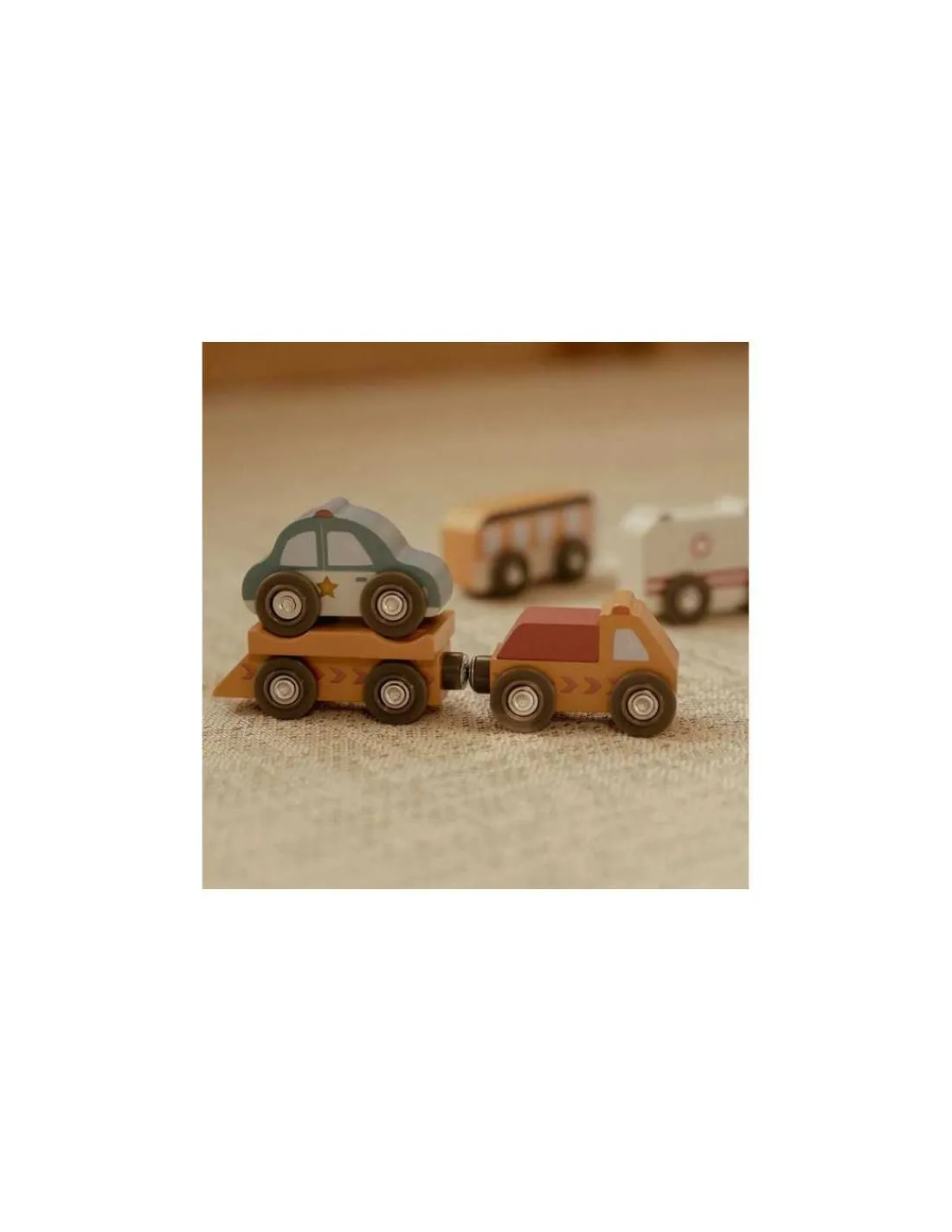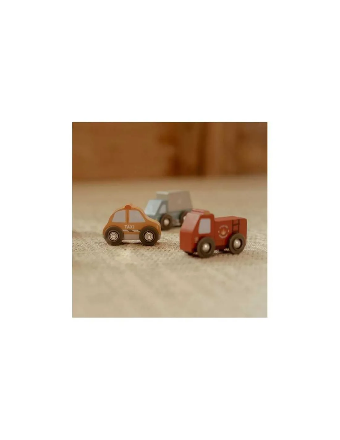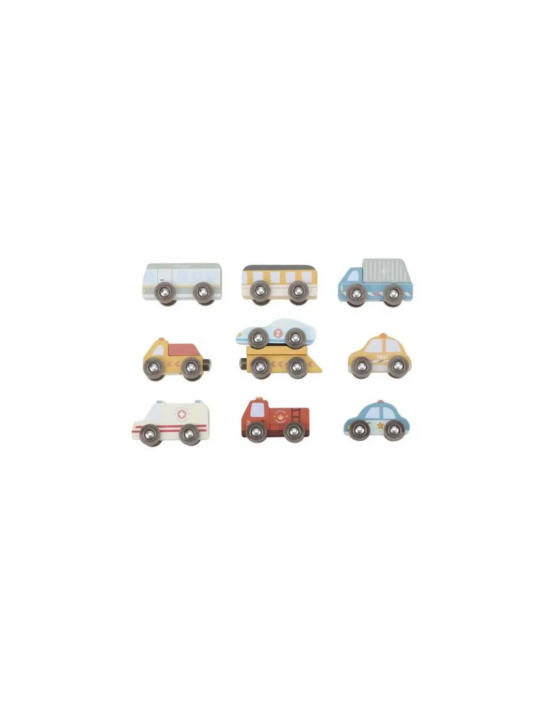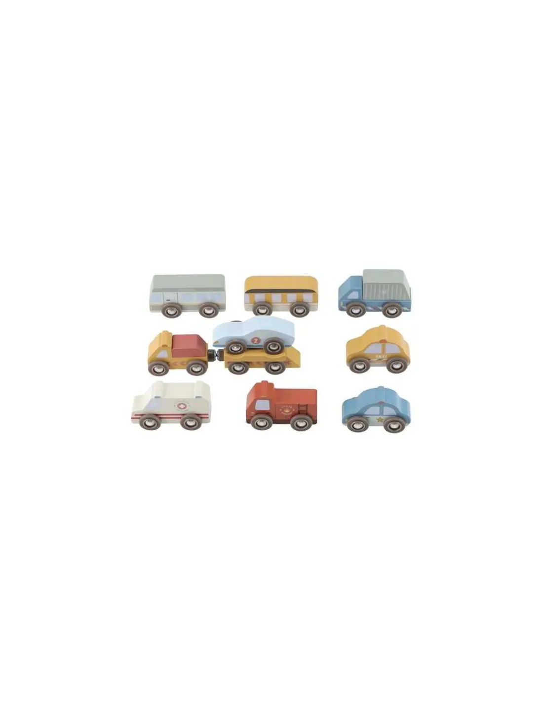 Avec ces véhicules de service et d’urgence en bois robuste, les enfants apprennent par le jeu de rôle à travailler ensemble et à aider les autres. Ils développent leur imagination en inventant de belles histoires. L’ensemble se compose d’une ambulance, d’une voiture de police, d’un camion de pompier, d’un camion poubelle, d’un car, d’un bus, d’un camion de livraison, d’une dépanneuse et d’une voiture de course. Avec leurs pneus compatibles avec les rails de circuit de train, ces petits véhicules parcourent les environs pour porter assistance à ceux qui en ont besoin.