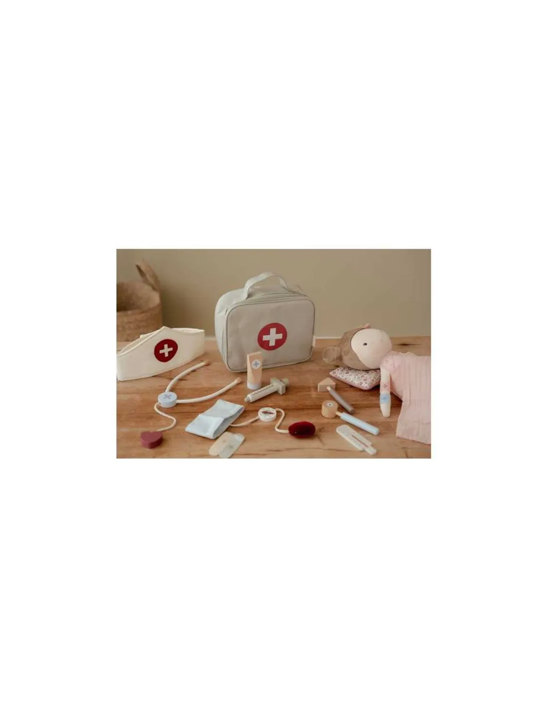 Le coffret contient une 1 mallette en tissu, 4 pansements, 1 thermomètre, 1 seringue, 1 tube de pommade, 1 stéthoscope, 1 marteau à réflexe, 1 tensiomètre, 1 calot et 1 otoscope.