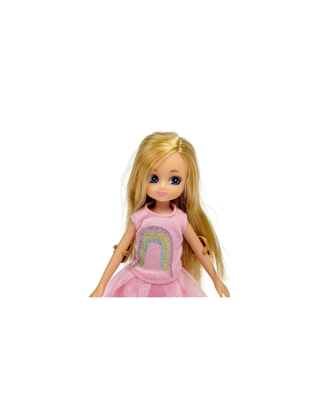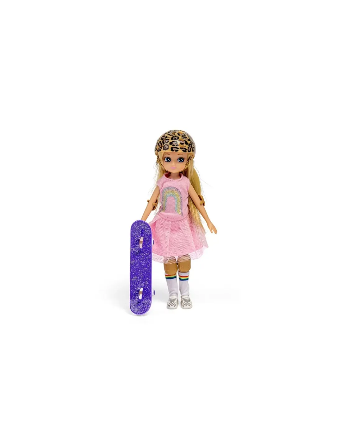 Une adorable poupée aux longs cheveux blonds et aux grands yeux bleus qui a pour ambition de devenir championne de skate. Cette poupée très sportive est vêtue d’une robe rose avec un arc en ciel, de chaussettes hautes et d’une paire de basket, d’un casque de protection à imprimé léopard, des coudières et des genoullières et un skateboard violet à paillettes.