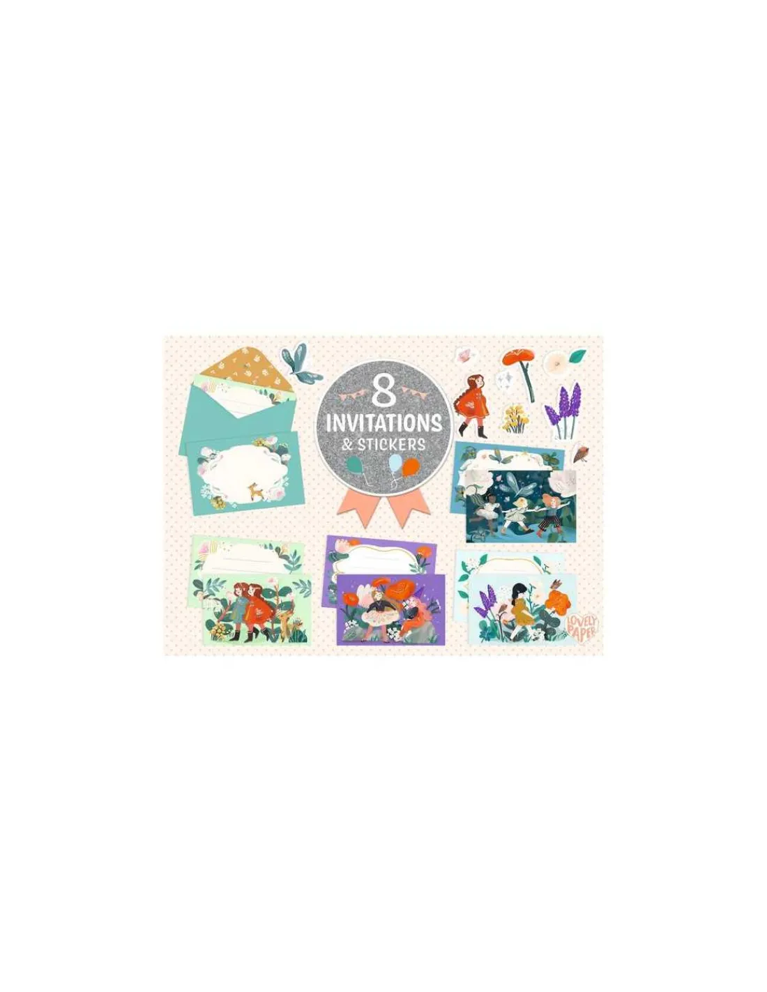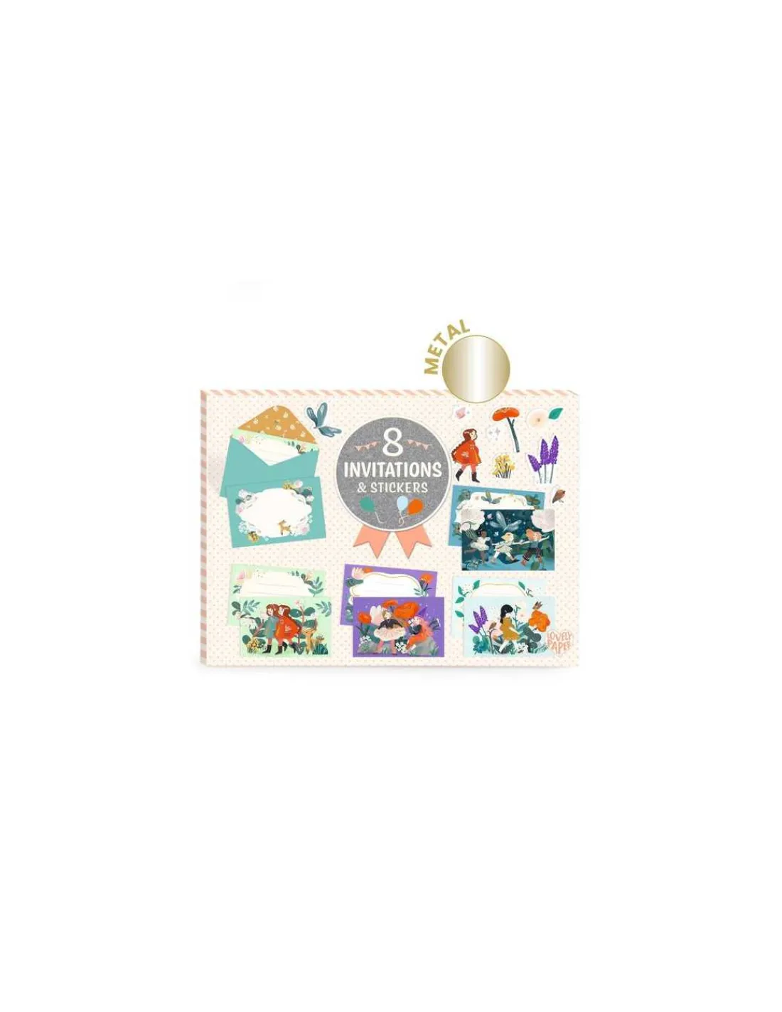 Découvrez les cartes d’invitation Copines du jardin de Lovely paper by Djeco, un coffret de papeterie aux effets métallisés et renfermant des cartes d’invitation illustrées, des enveloppes assorties et des planches de stickers pour personnaliser chaque message.