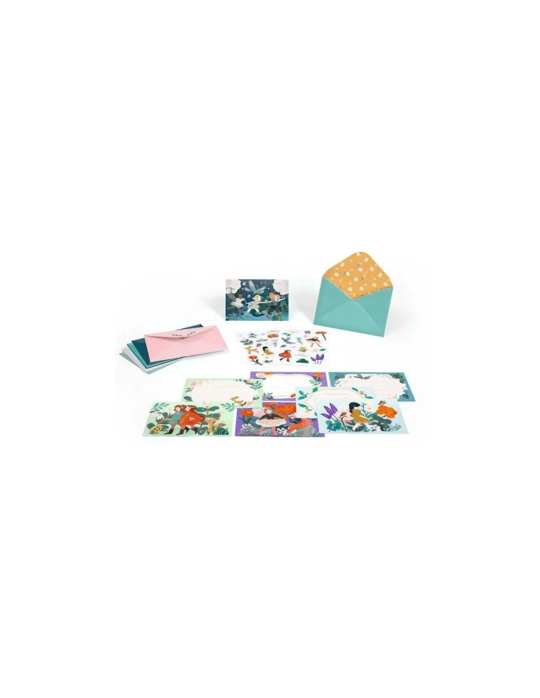 Cette boite de correspondance comprend 8 cartes illustrées avec des lignes pour écrire facilement un message clair et soigné, 8 enveloppes illustrées pour ajouter une touche de charme et d’originalité et surprendre dès l’ouverture, ainsi que 2 planches de stickers pour personnaliser chaque invitation.