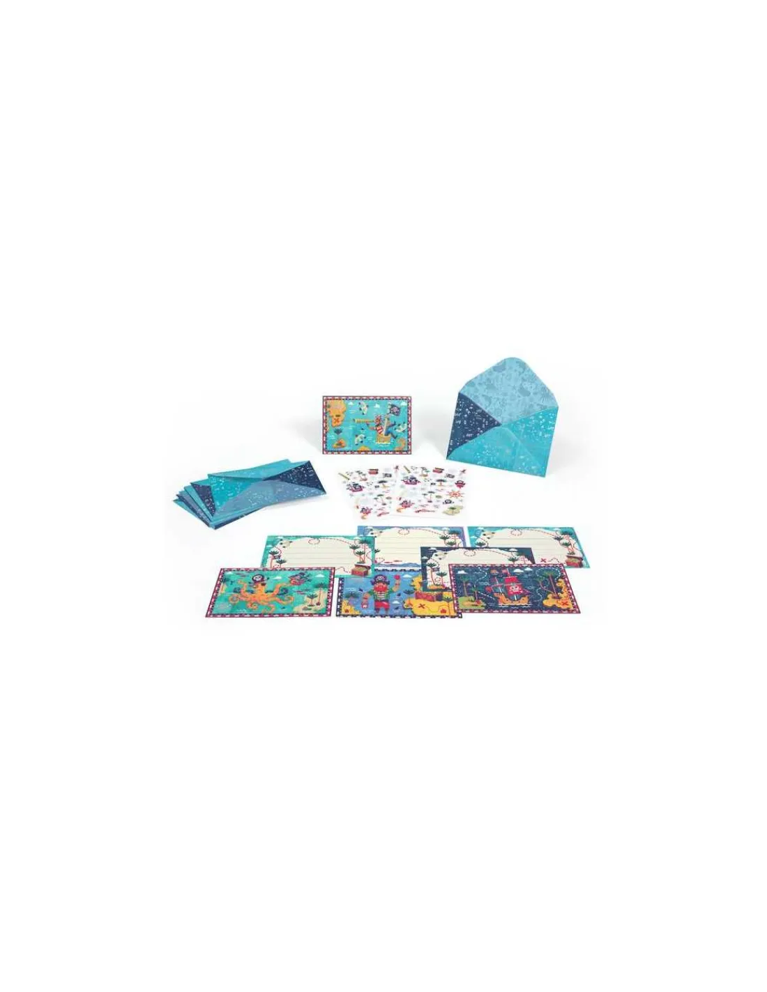 Ce coffret contient 8 cartes d’invitation (4 x 2), 8 enveloppes (4 x 2) et 2 planches de stickers sur le thème « Pirate ».