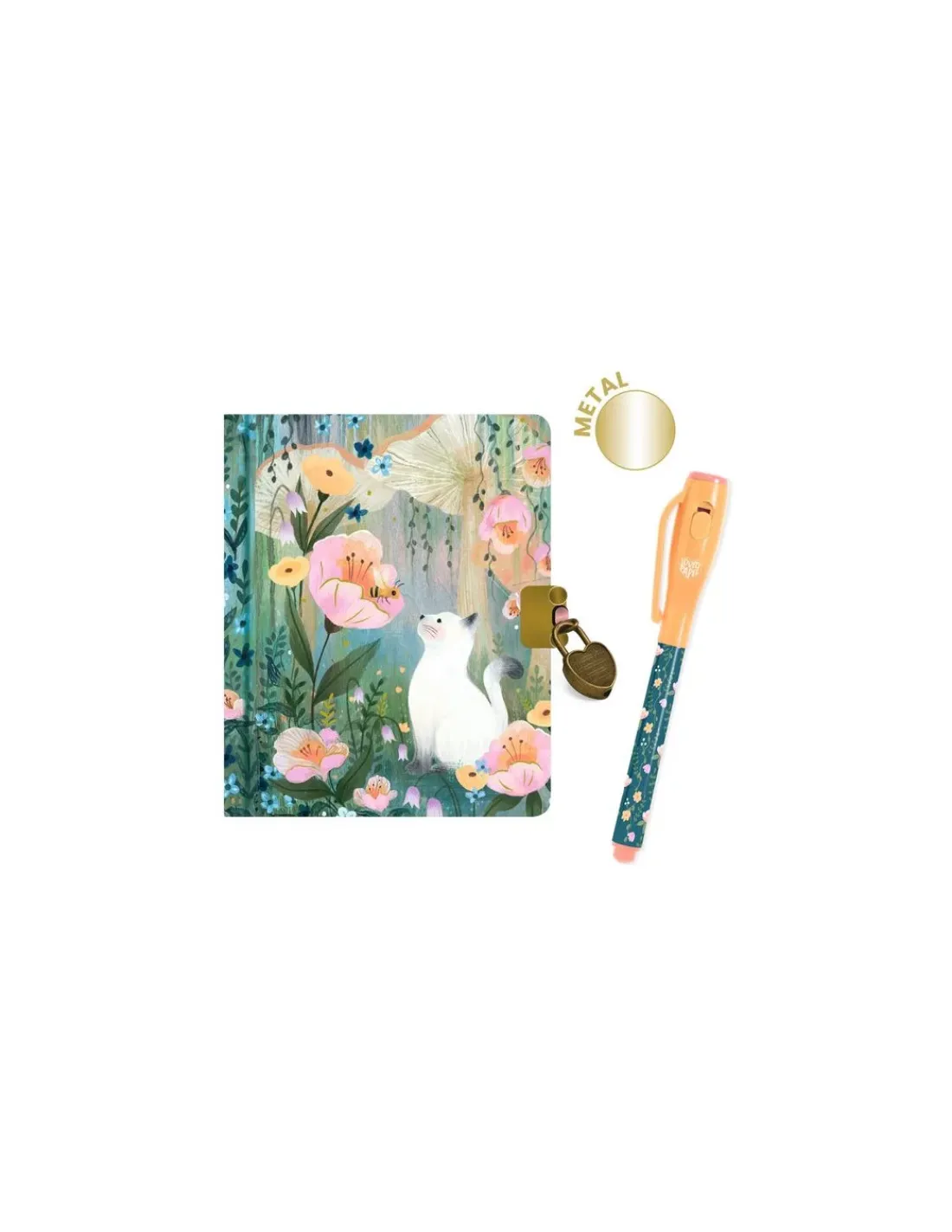 Un carnet secret avec une couverture rigide et imprimée comprenant 88 pages avec lignes (papier 120 g/m²) et livré avec 1 cadenas, 2 clés et 1 feutre magique avec bouton On/Off qui fonctionne avec 3 piles LR44 HD fournies.