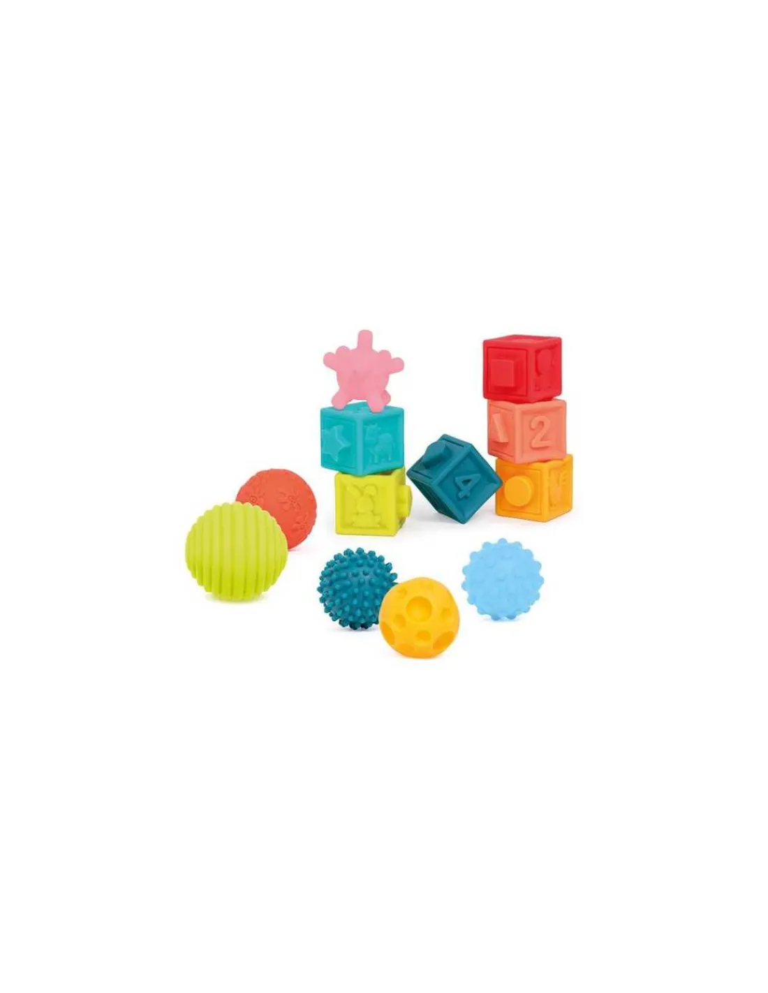 Grâce à leurs couleurs vives et à leurs différentes textures, les balles et les cubes stimulent les sens de bébé tout en l’amusant. 6 balles souples et tactile et 6 cubes souples et légers faciles à manipuler et à empiler où chaque face propose une nouvelle découverte.