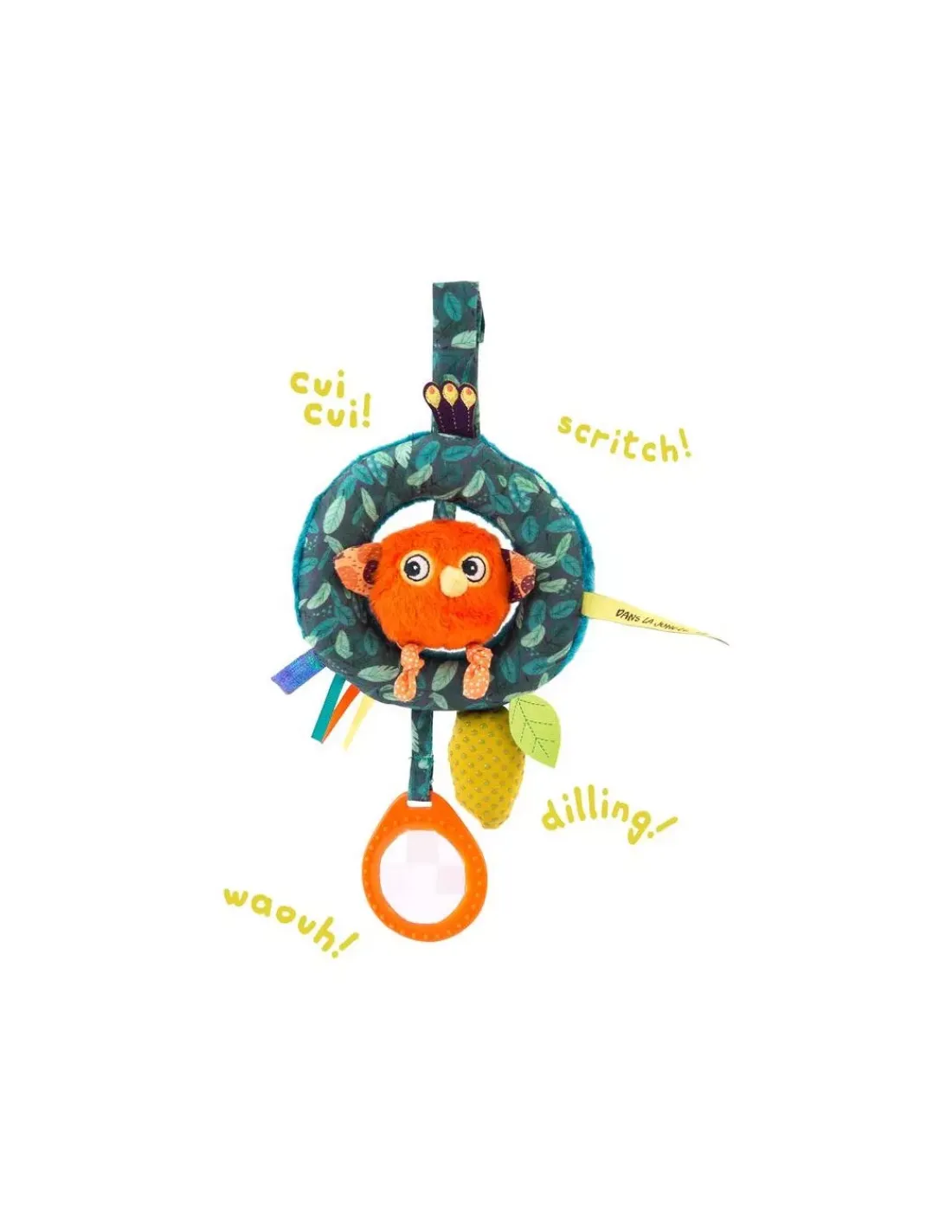 Cet anneau d’activités aux motifs tropicaux comporte un prisme, des petits gris-gris et des feuilles pour amuser bébé. Au centre, un petit poussin orange est bien installé, comme sur une balançoire. Ce jouet d’activités en tissu deviendra le compagnon préféré de bébé, il peut être facilement accroché au parc ou à la poussette.