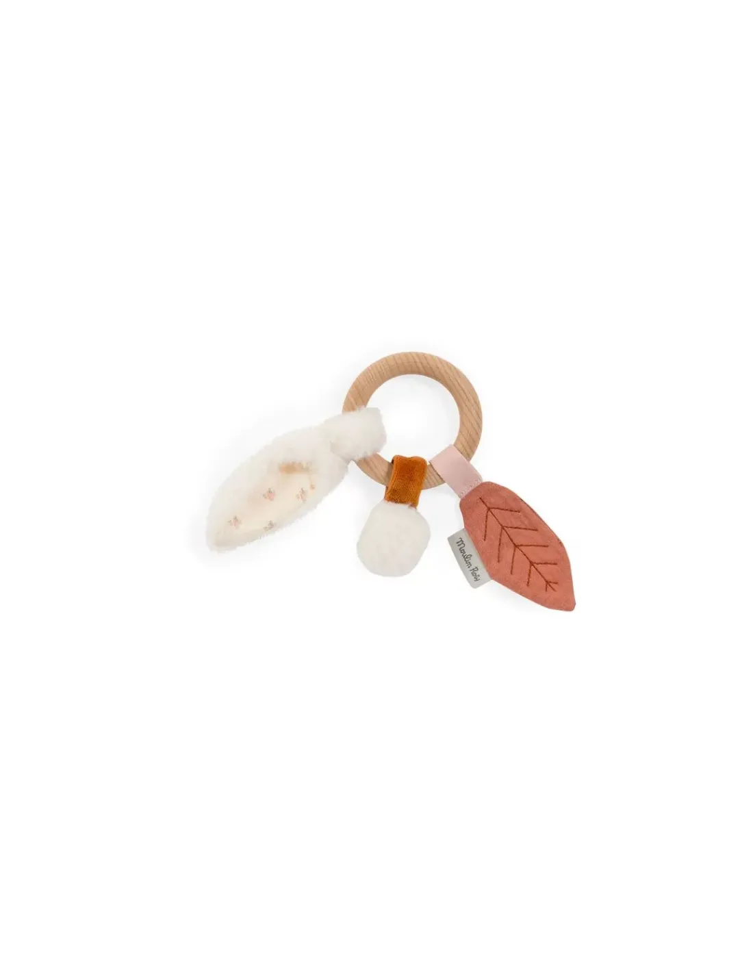 Découvrez l’anneau hochet bois lapin de la collection Après la pluie de Moulin Roty, un anneau rond en bois naturel, sur lequel sont cousus une feuille, une oreille et une queue de lapin en fourrure avec quelques surprises… Du papier bruissant et des grelots pour éveiller bébé durant les balades.