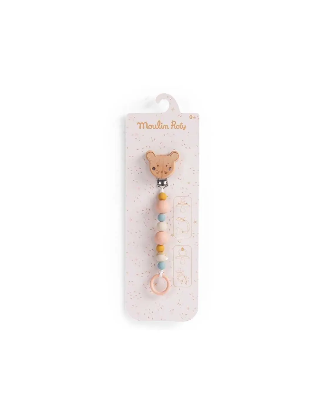 Découvrez l’attache tétine souris de la collection La petite école de danse de Moulin Roty, un cadeau de naissance utile et pratique pour les bébés.