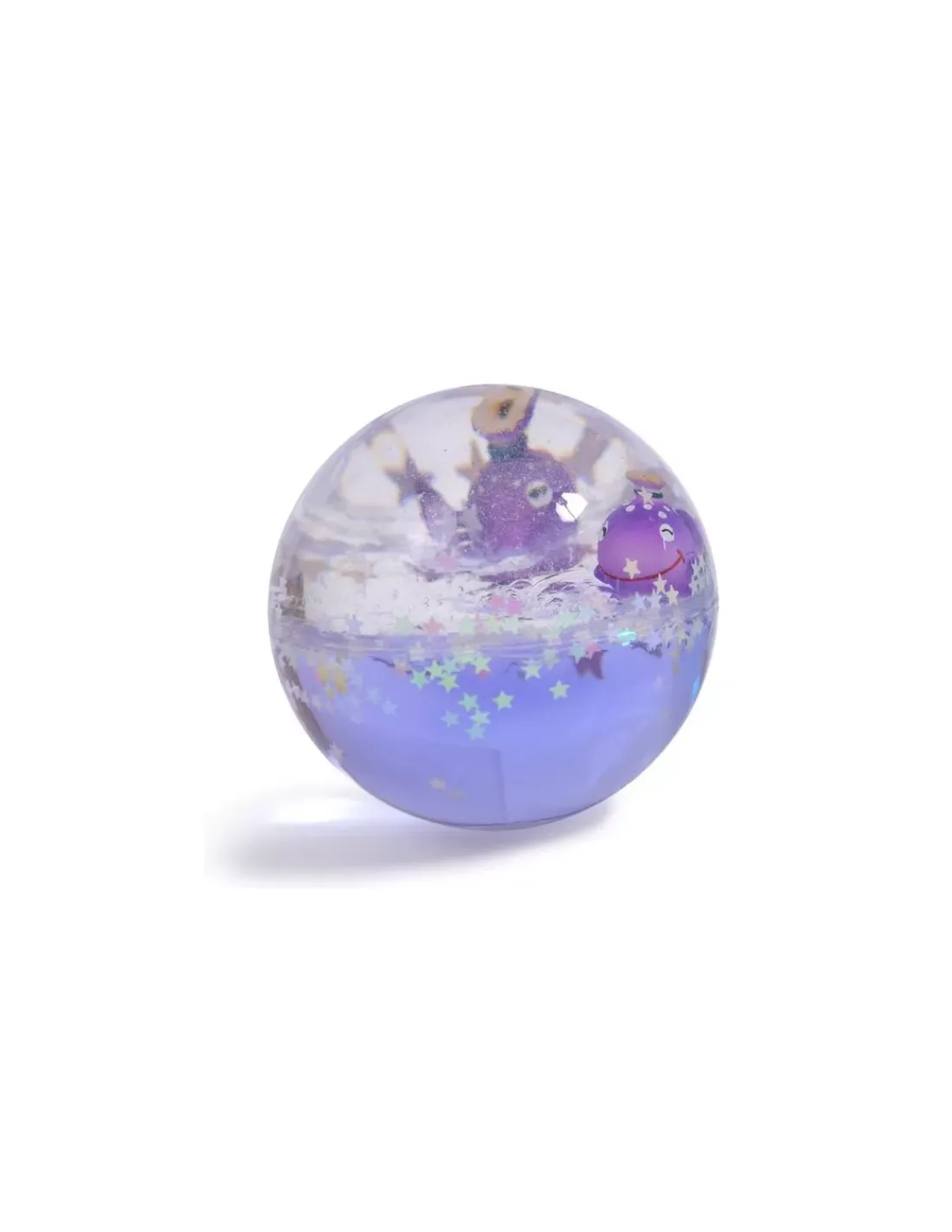 Balle rebondissante remplie de liquide coloré, où l’on voit une baleine se baigner au milieu d’étoiles brillantes!