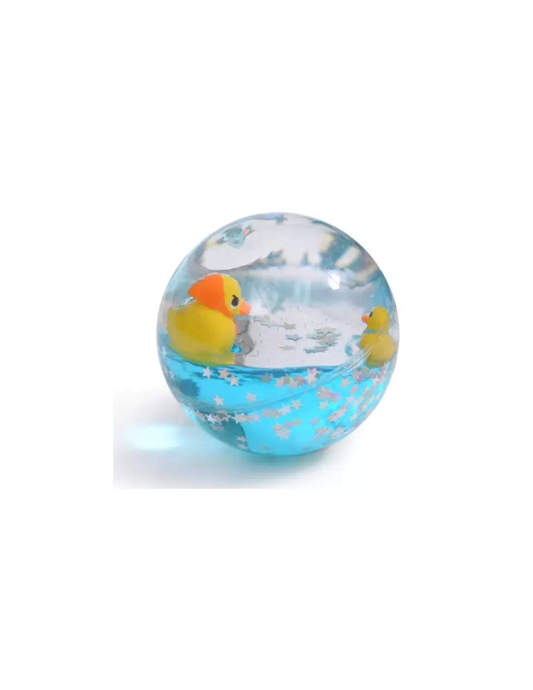 Balle rebondissante remplie de liquide coloré, où l’on voit un canard se baigner au milieu d’étoiles brillantes