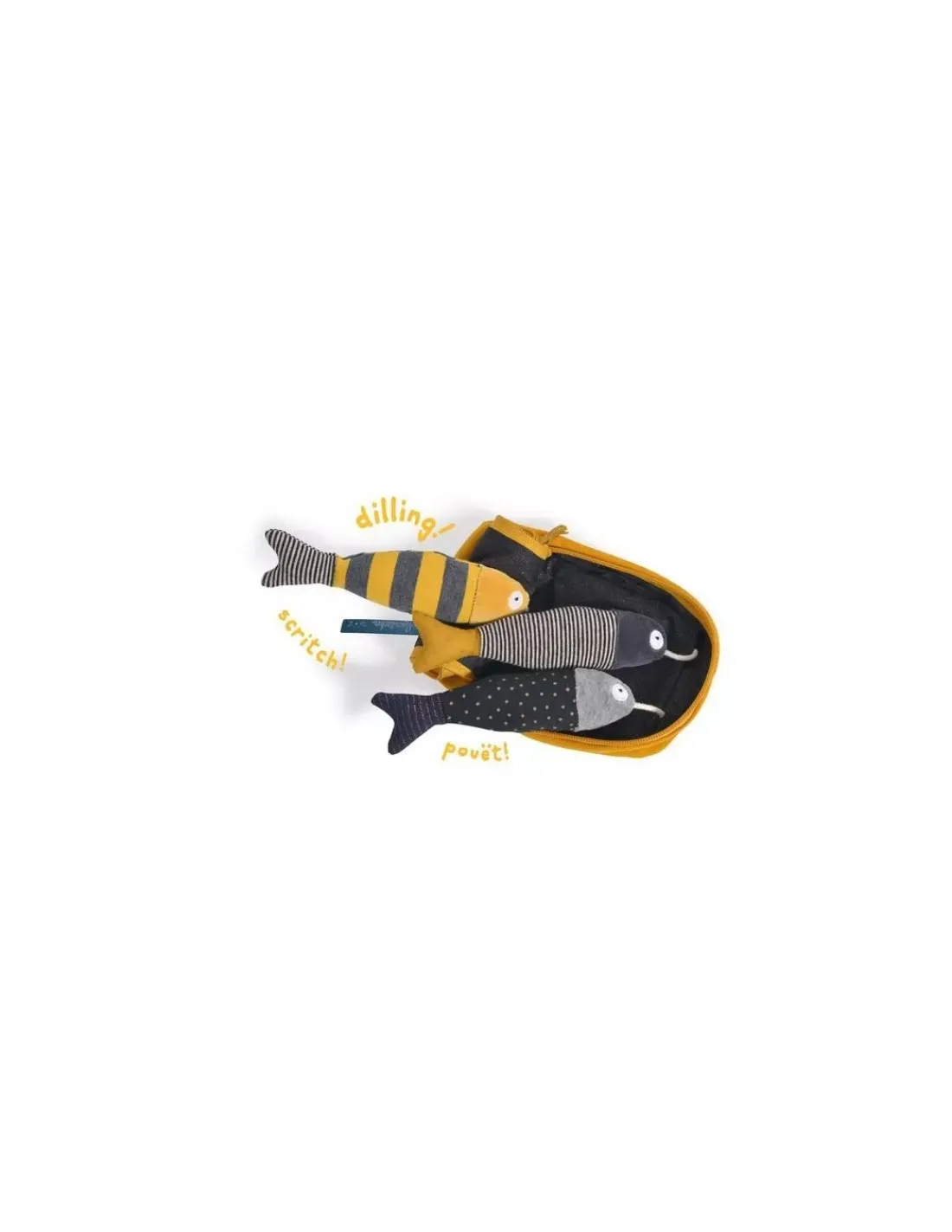 Une belle boite à sardine avec un pouet-pouet dans un poisson, un hochet dans un autre et un plastique qui fait du bruit dans le dernier.