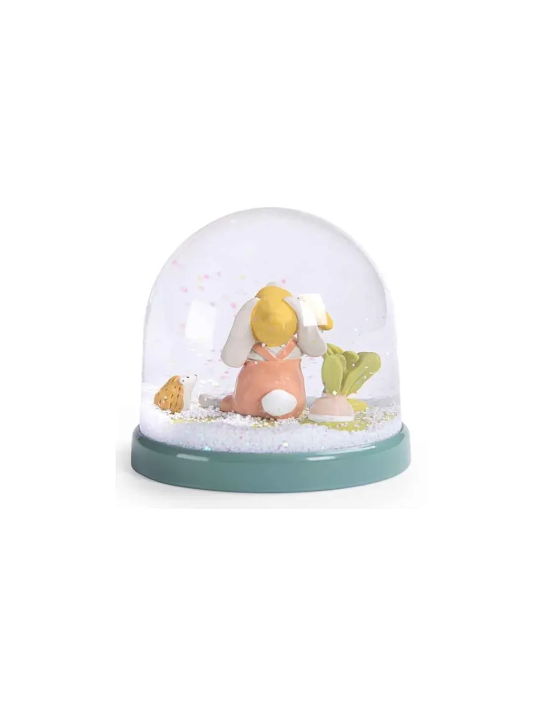 Une belle boule à neige représentant un moment de tendresse entre un lapin et ses amis. Les voilà au jardin, au milieu des flocons, se partageant radis et petits secrets!