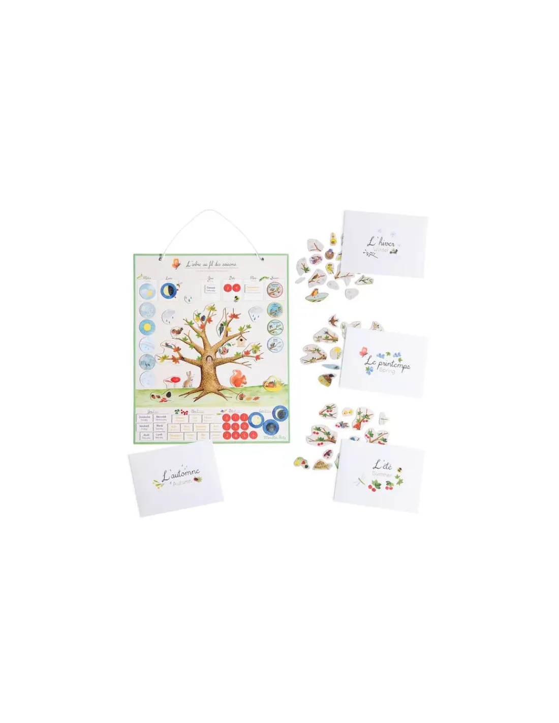 Un grand calendrier comprenant plus de 100 magnets pour se repérer dans le temps et apprendre les saisons, en habillant l’arbre illustré au fil de l’année. Il comprend aussi 4 enveloppes pour ranger chaque saison.