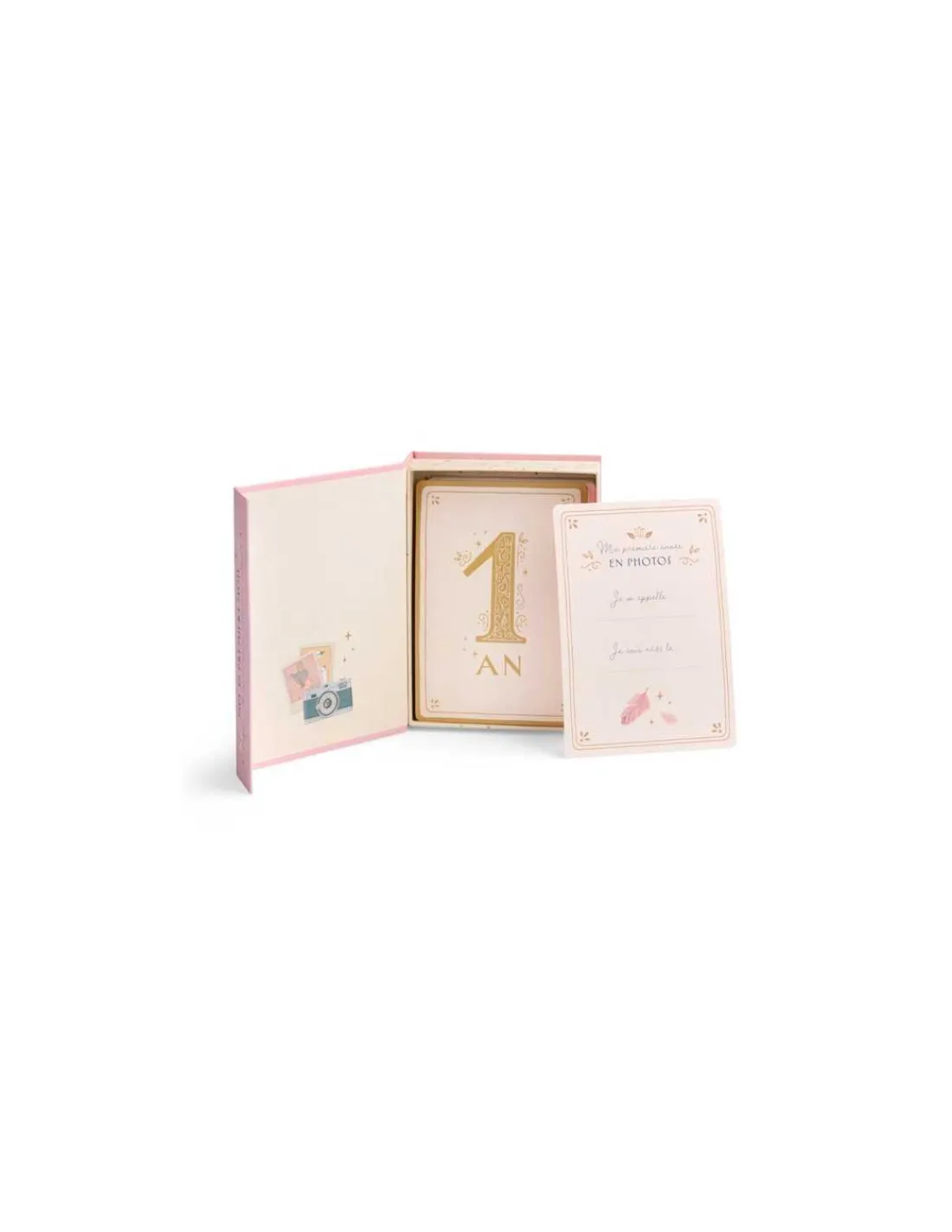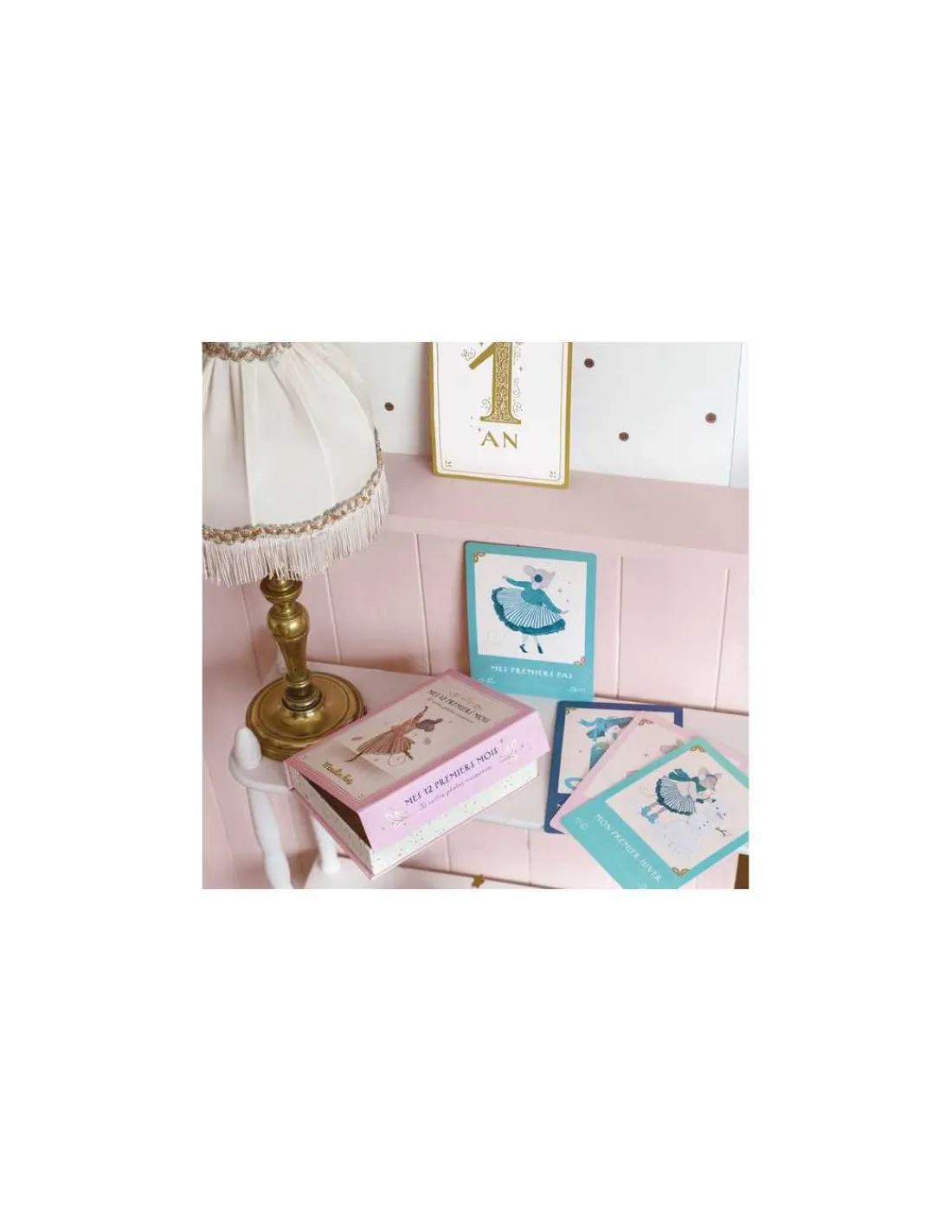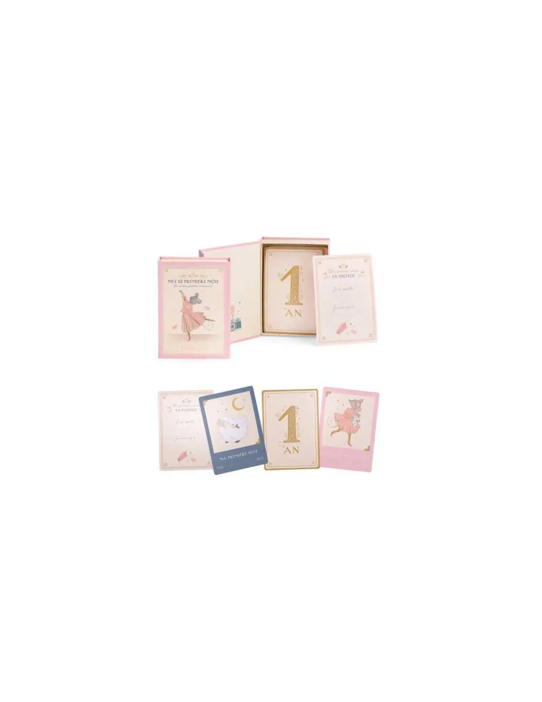 Découvrez les cartes Mes 12 premiers mois de la collection La petite école de danse de Moulin Roty, un coffret de 30 cartes pour prendre en photo bébé et retracer les grandes étapes de ses 12 premiers mois. Sur chacune d’elle, un côté thématique illustré avec les tendres personnages de la collection et l’autre pour coller la photo et conserver ces beaux souvenirs.