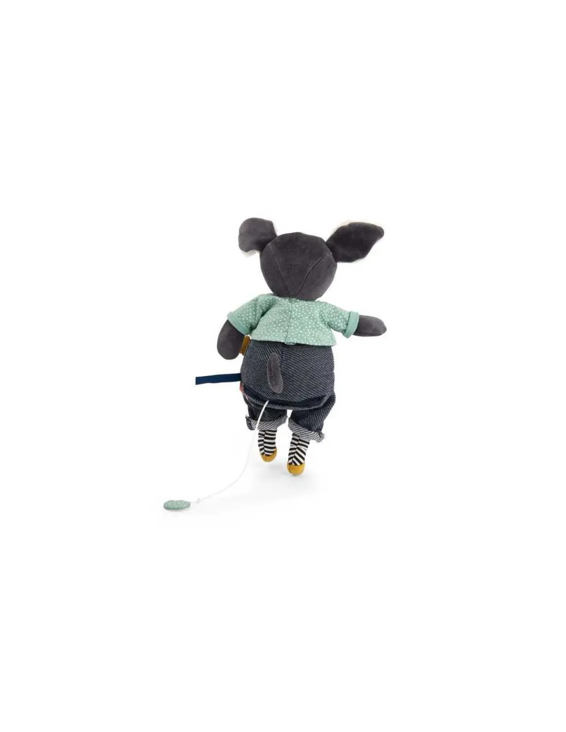 Jeu de textures et couleurs pour Puce le compagnon musical. La boîte à musique est actionnée en tirant sur la pastille. La boîte à musique s’enlève pour pouvoir le passer en machine.