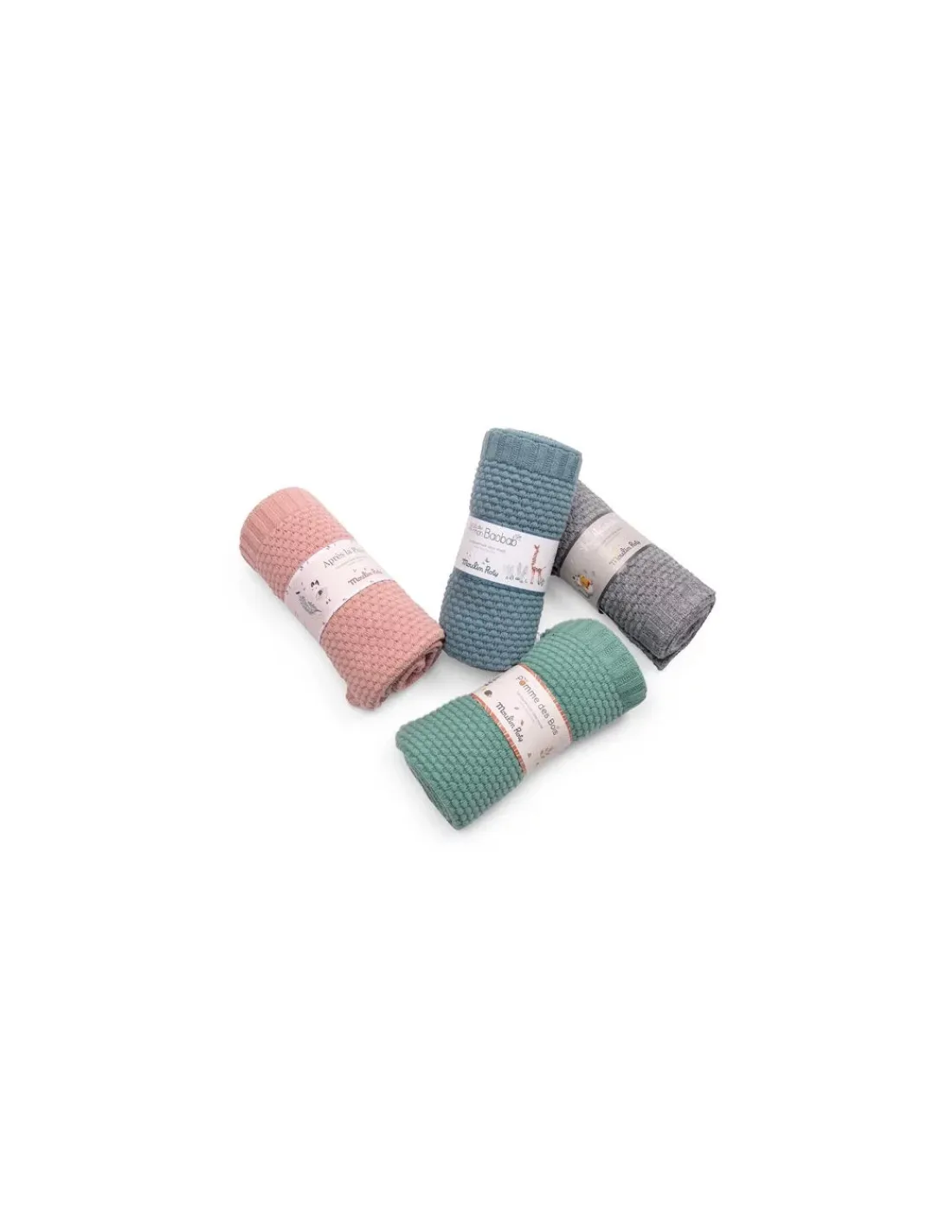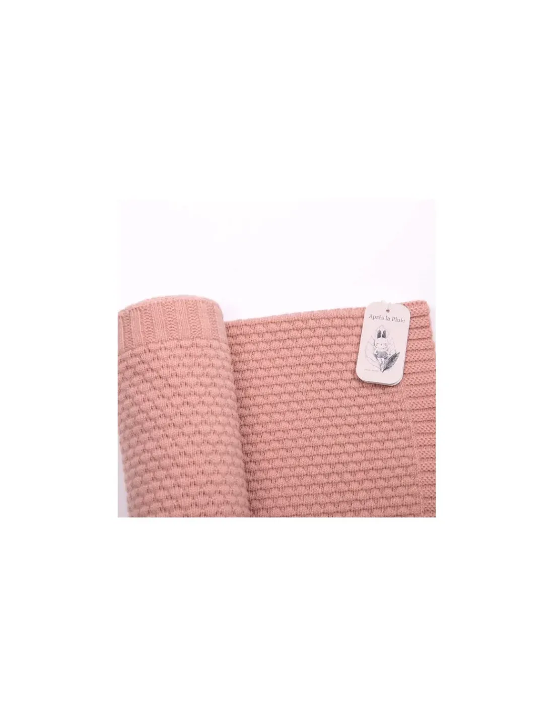 Découvrez la couverture laine tricotée rose de la collection Après la pluie de Moulin Roty, une couverture en tricot rose certifiée OEKO-TEX® qui aide les petits à réguler leur température corporelle grâce aux matières utilisées : 25% coton, 25% viscose, 25% polyamide, 22% laine mérinos et 3% cachemire.