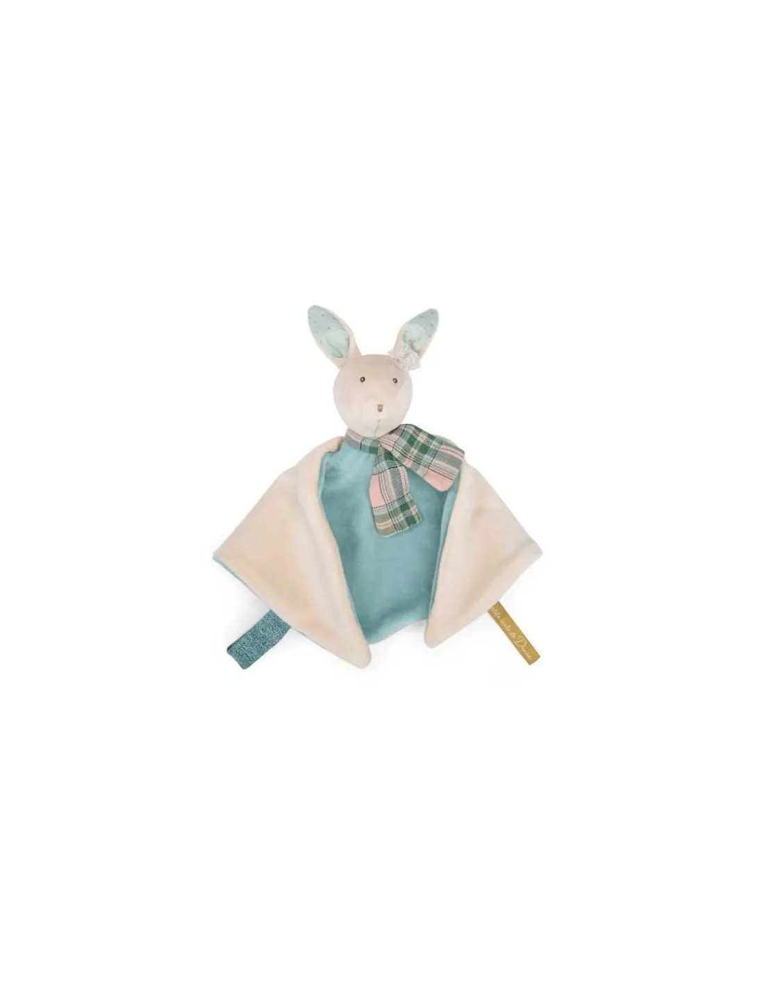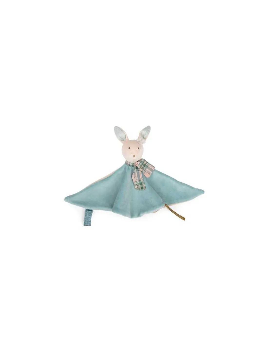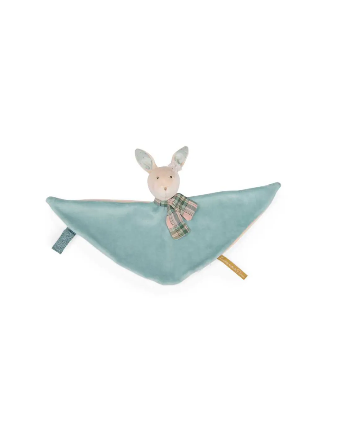 Un doudou lapin au doux visage brodé pour accompagner bébé. En éponge velours bleu et crème avec attache-tétine. Plat, il est facile à saisir par les petits mains. Peut être brodé à son prénom pour le rendre encore plus unique.