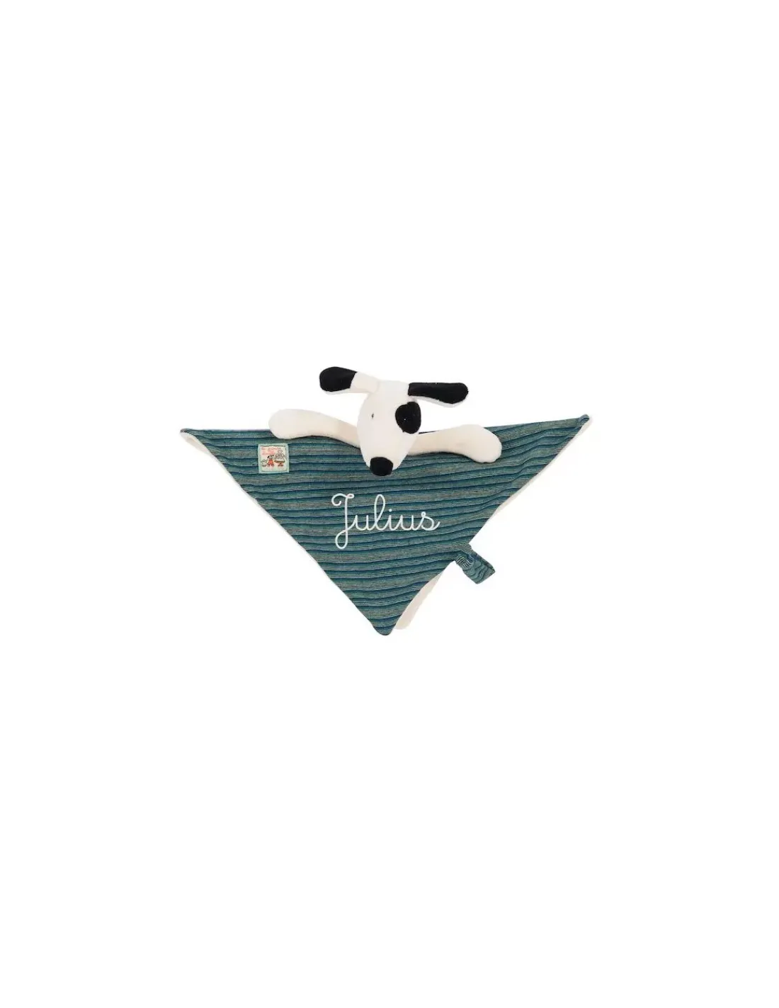 Découvrez le doudou Julius le chien de la collection La grande famille de Moulin Roty, un doudou plat de forme carré avec la tête du chien qui ressort. Un doudou coloré que votre enfant va tout de suite adopter et qu’il pourra attraper par ses quatres coins, ses oreilles ou ses bras.