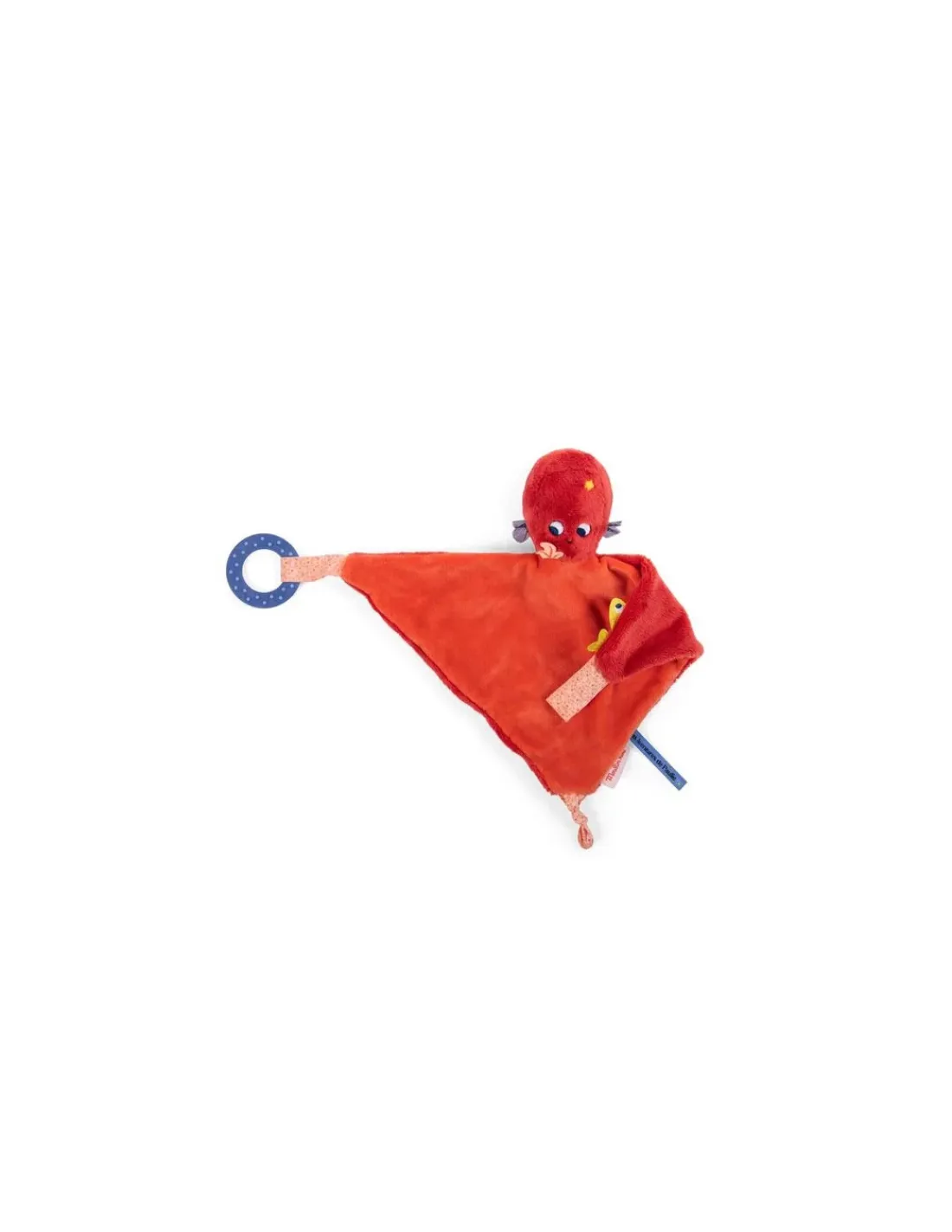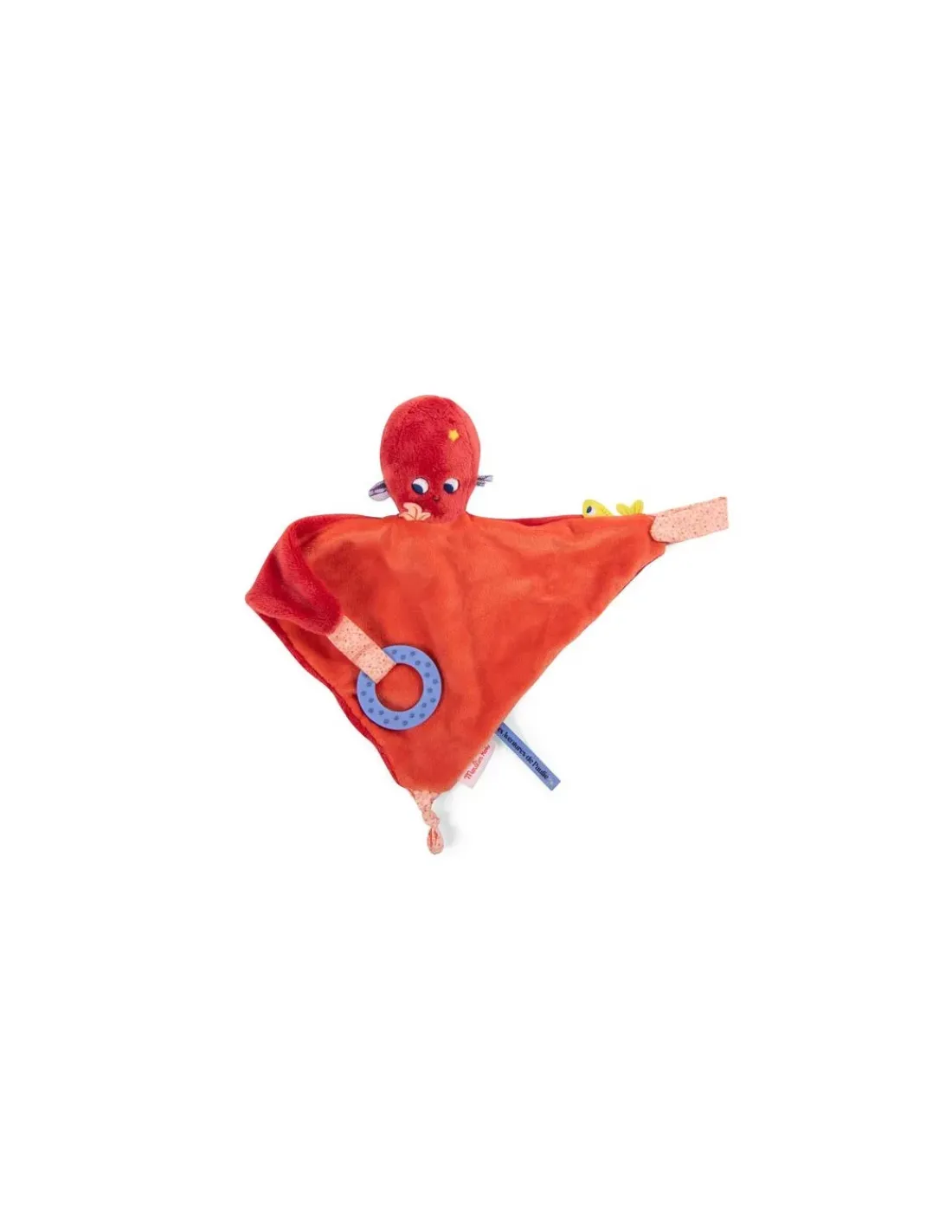 Ce doudou plat en forme de poulpe est un compagnon qui adore les câlins. Facile à attraper par les petites mains, il possède également un anneau de dentition qui viendra soulager les poussées dentaires de bébé, ainsi qu’un attache tétine pour en faire un compagnon inséparable. Un compagnon bi-matières réconfortant décoré de petites étiquettes très appréciées des bébés et de détails brodés.