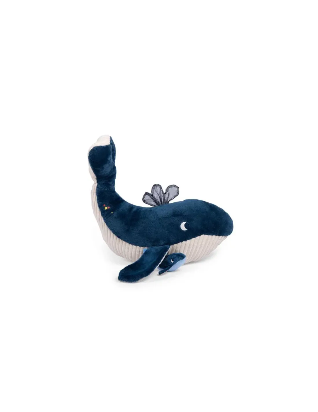 Ce jouet d’éveil sensoriel en tissu offre de nombreuses activités et textures pour éveiller bébé en douceur : miroir, grelot, papier crissant, étiquettes à attraper… Un grand mammifère marin amusant avec une foule d’activités complétée par un jeu de matières douces et côtelées, une peluche qui accompagnera votre enfant au quotidien pour des moments de douceur et de tendresse.