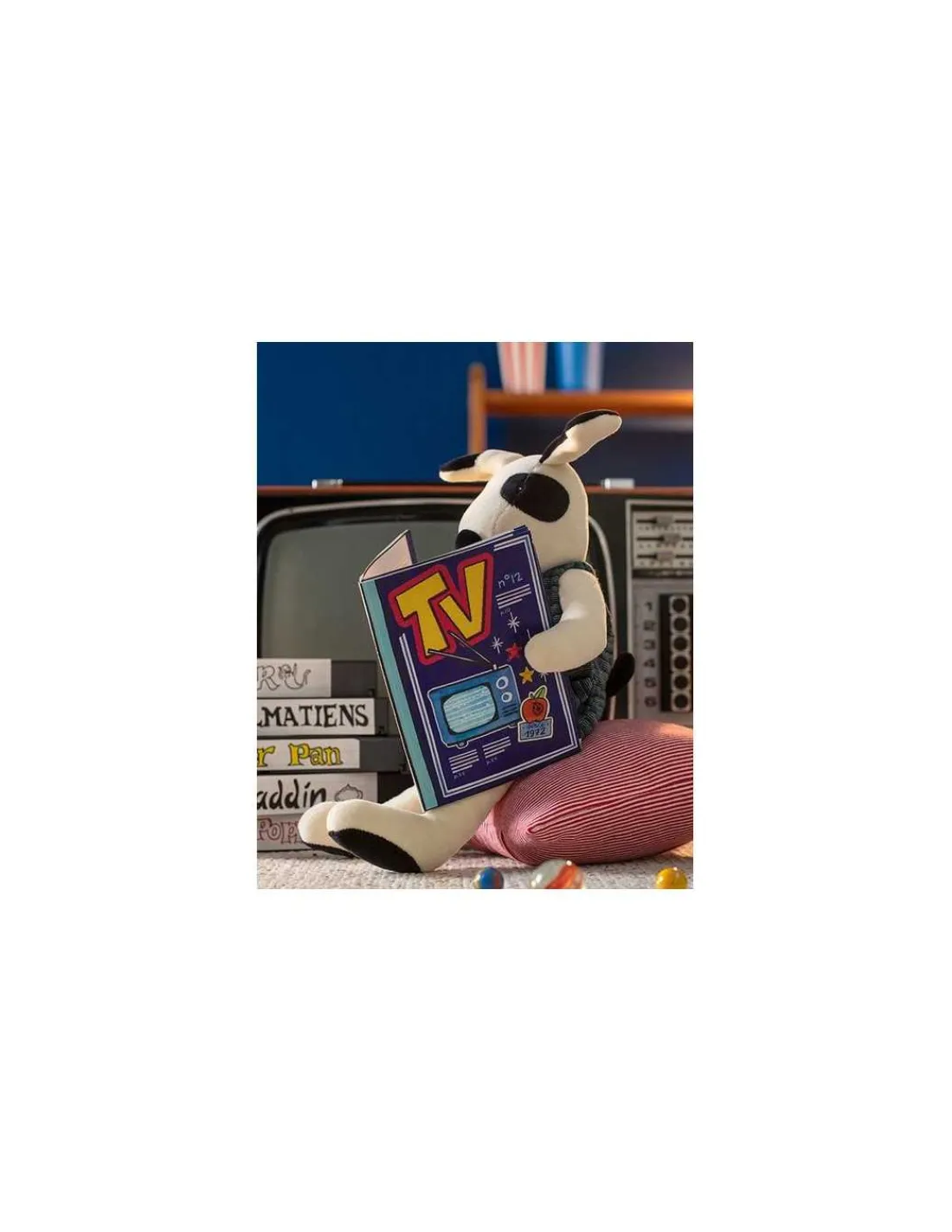 Découvrez Julius le chien de la collection La grande famille de Moulin Roty, un grand doudou chien de 30 cm que bébé pourra attraper par les bras ou les jambes. Un chien reconnaissable avec sa tache autour de l’oeil et sa belle salopette.