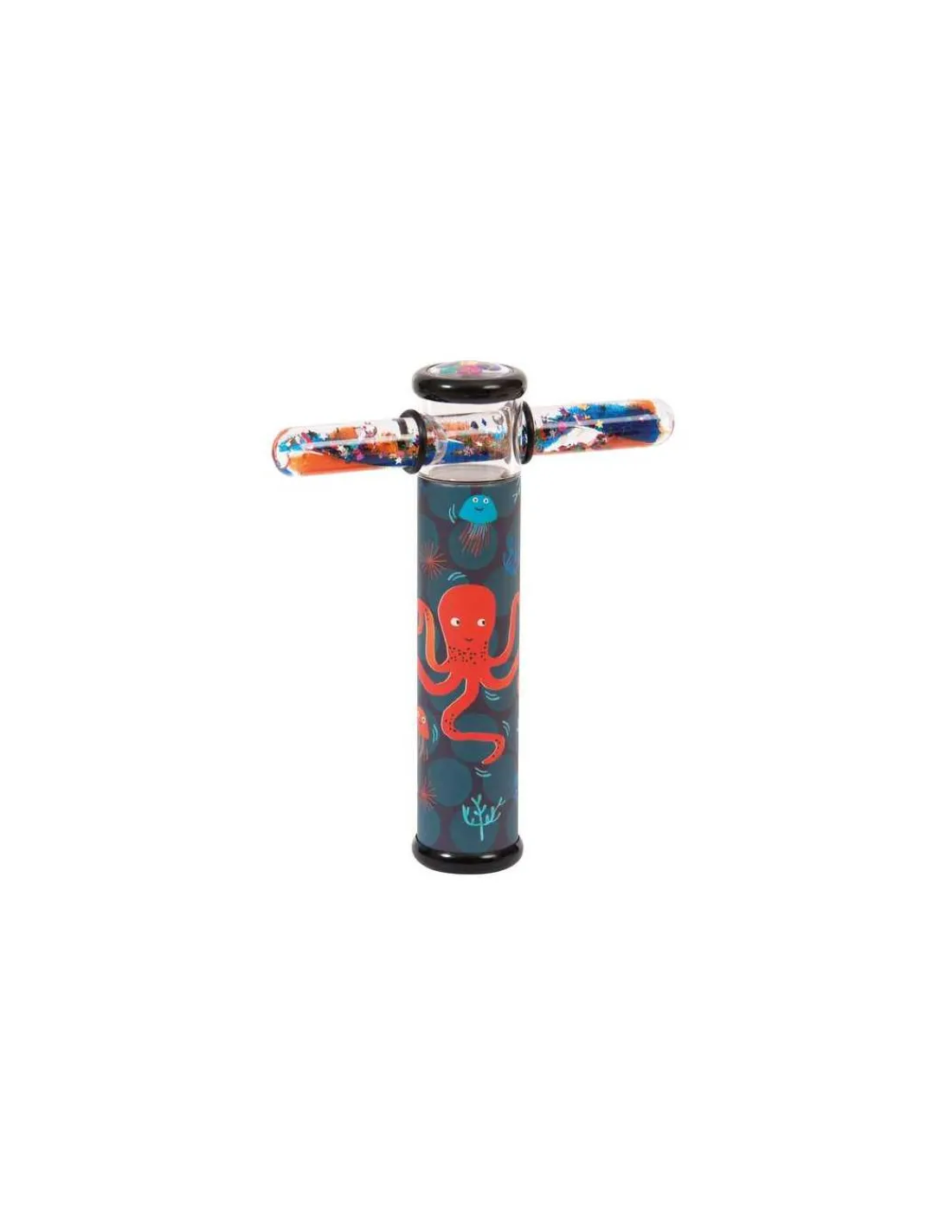 Un kaléidoscope aux illustrations naïves et colorées pieuvres et coraux avec à son extrémité un tube coulissant contenant du gel et des paillettes qui, associé aux petits miroirs du kaléidoscope, démultiplie à l’infini les combinaisons de formes et de couleurs.