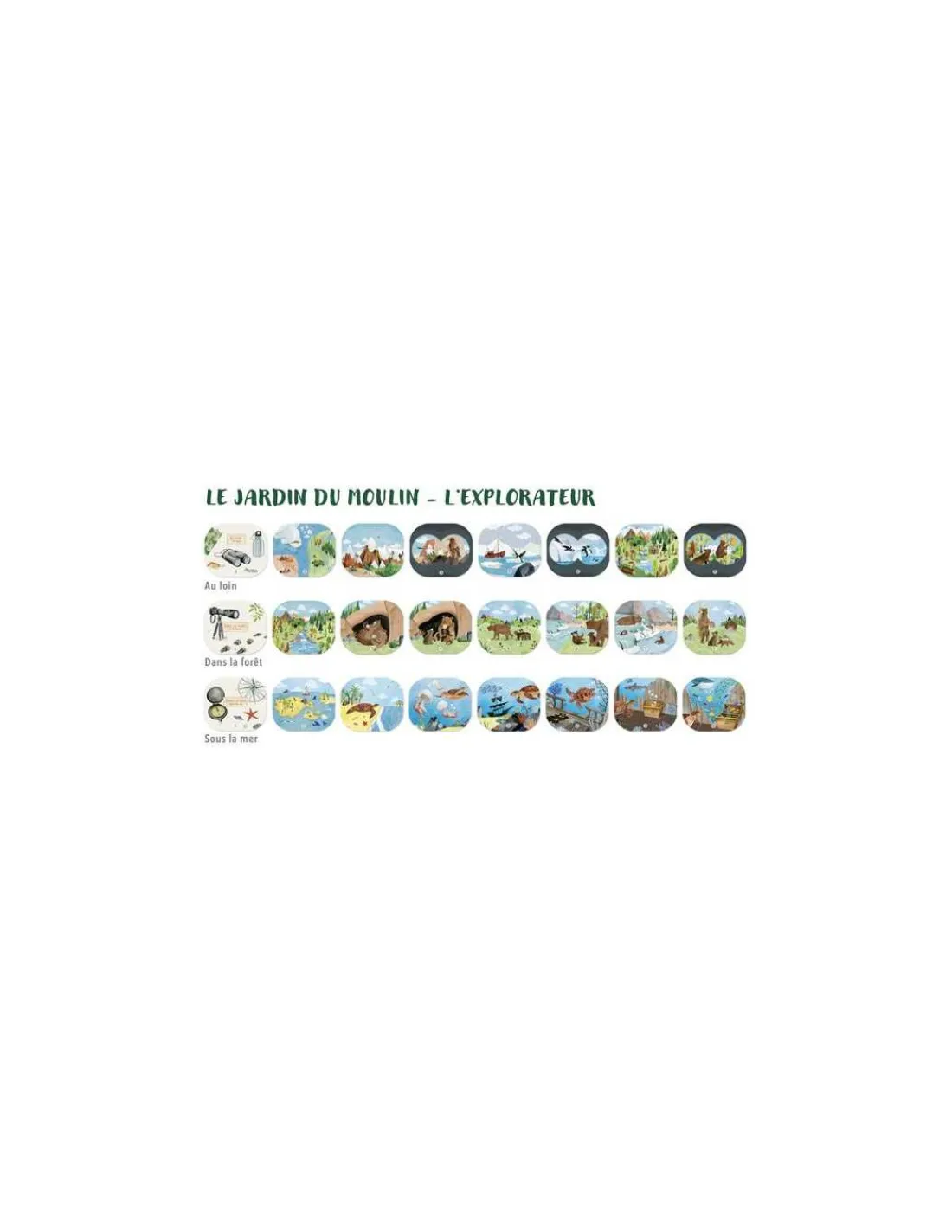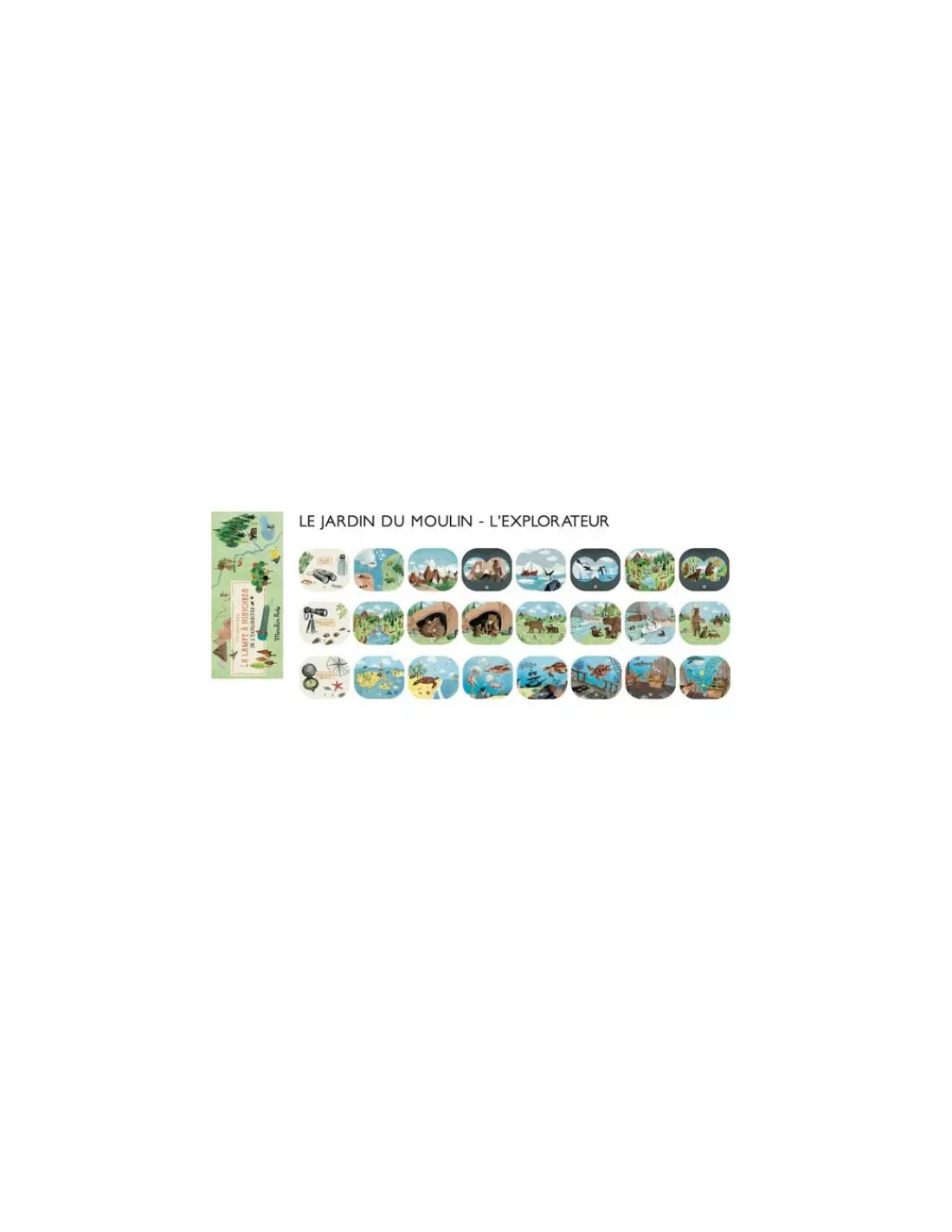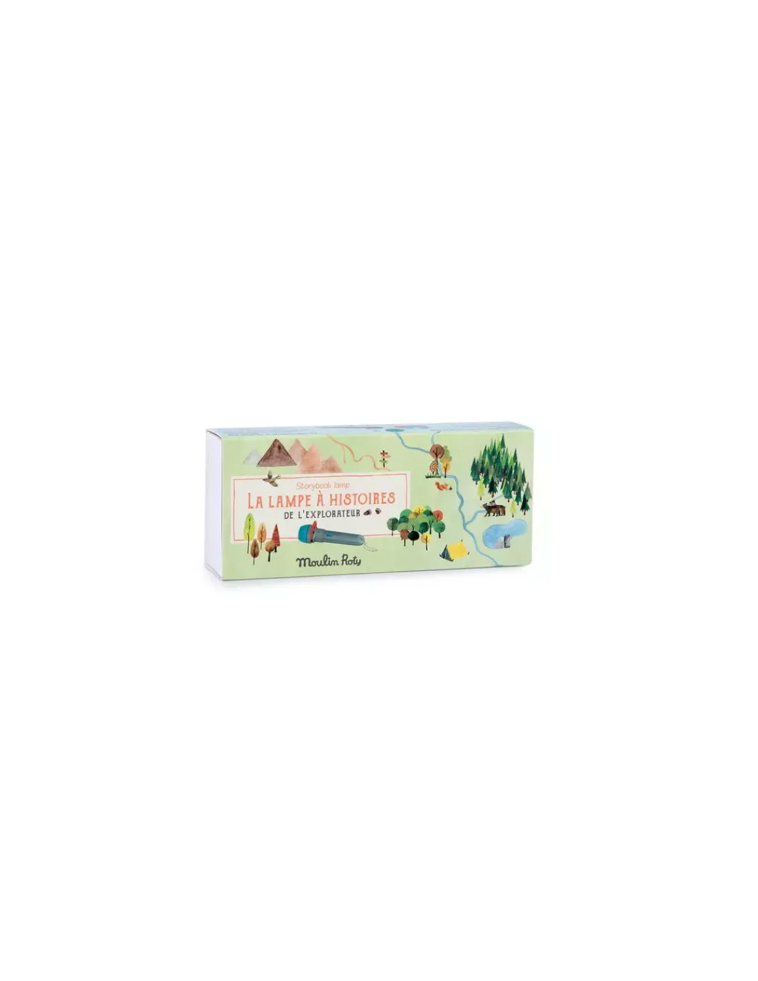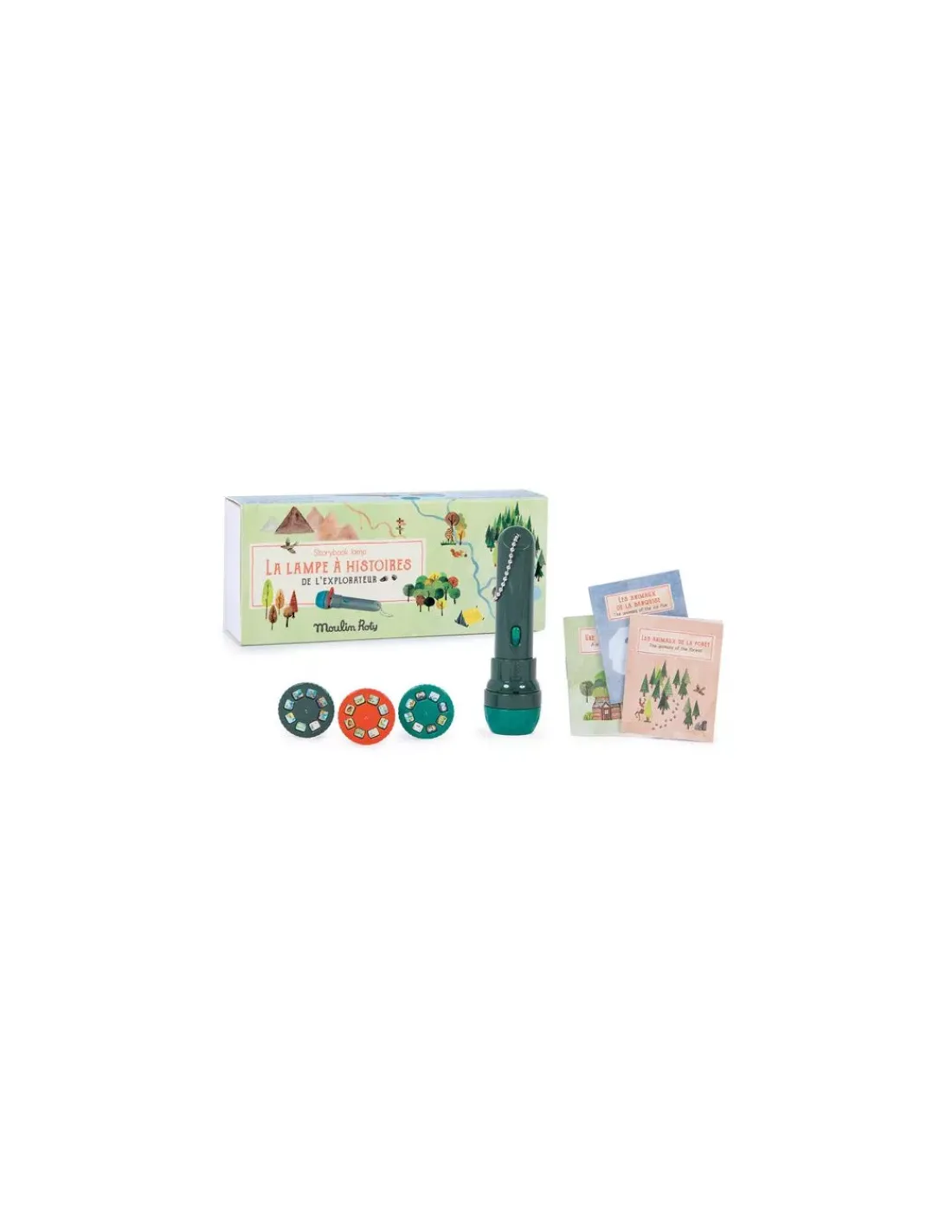 Découvrez la lampe à histoires de l’explorateur de la collection Le jardin du moulin de Moulin Roty, un coffret comprenant une lampe à histoires, 3 disques et 3 mini livres pour apprendre le nom des animaux en image.