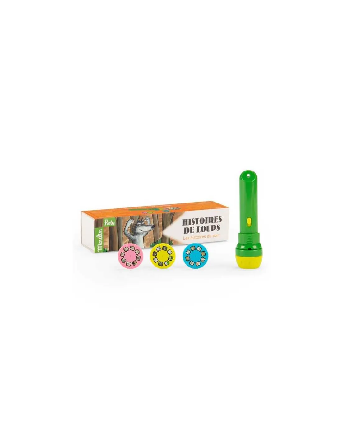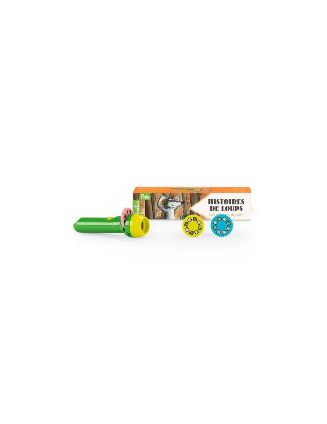 Découvrez la lampe à histoires Loup Ecole des loisirs de Moulin Roty, une lampe torche qui projette des images en couleurs pour raconter de jolies histoires à votre enfant. 3 disques, 3 histoires originales pour découvrir les aventures de ce célèbre loup.