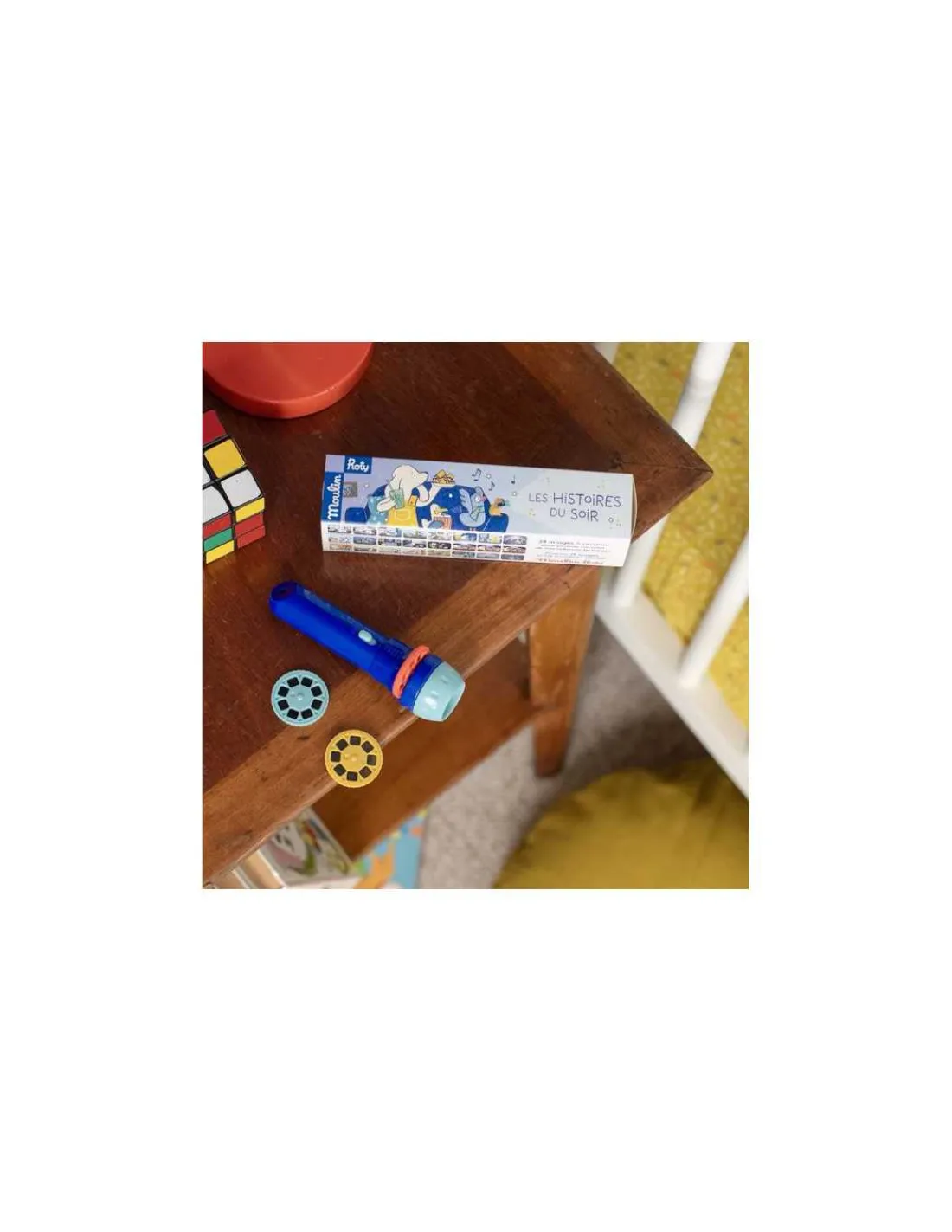 3 disques projetés sur le mur raconte une histoire en couleur sans paroles des personnages de la collection Puce & Pilou. Un instant magique pour développer l’imagination des enfants.