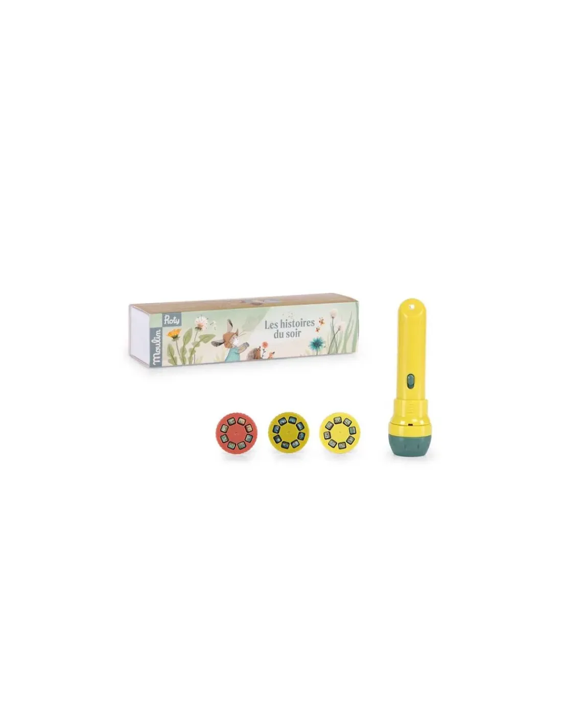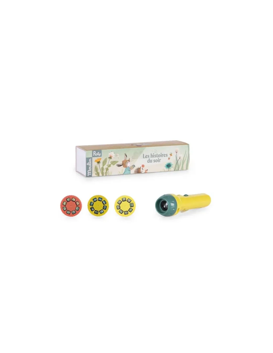Découvrez la lampe à histoires de la collection Trois Petits Lapins de Moulin Roty, une lampe torche qui projette des images en couleurs pour raconter de jolies histoires à votre enfant.