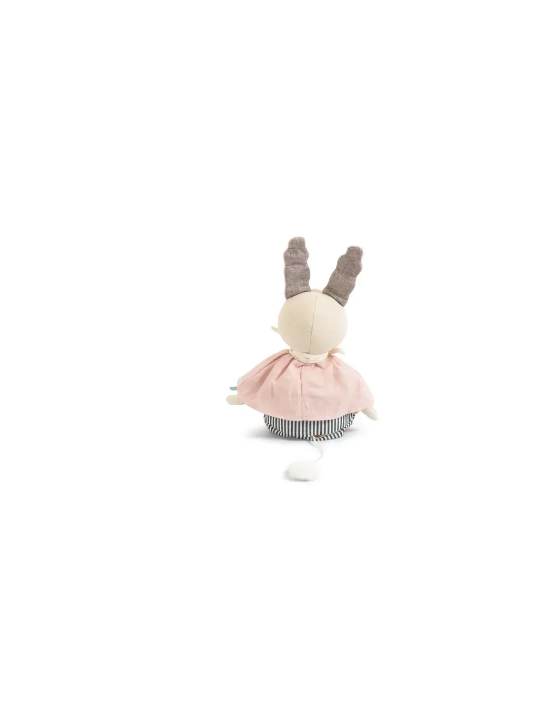En tissu chambray crème avec de grandes oreilles en polaire. Elle est vêtue d’un panty rayé et d’une blouse rose en lin. La boîte à musique s’enlève pour pouvoir la passer en machine.