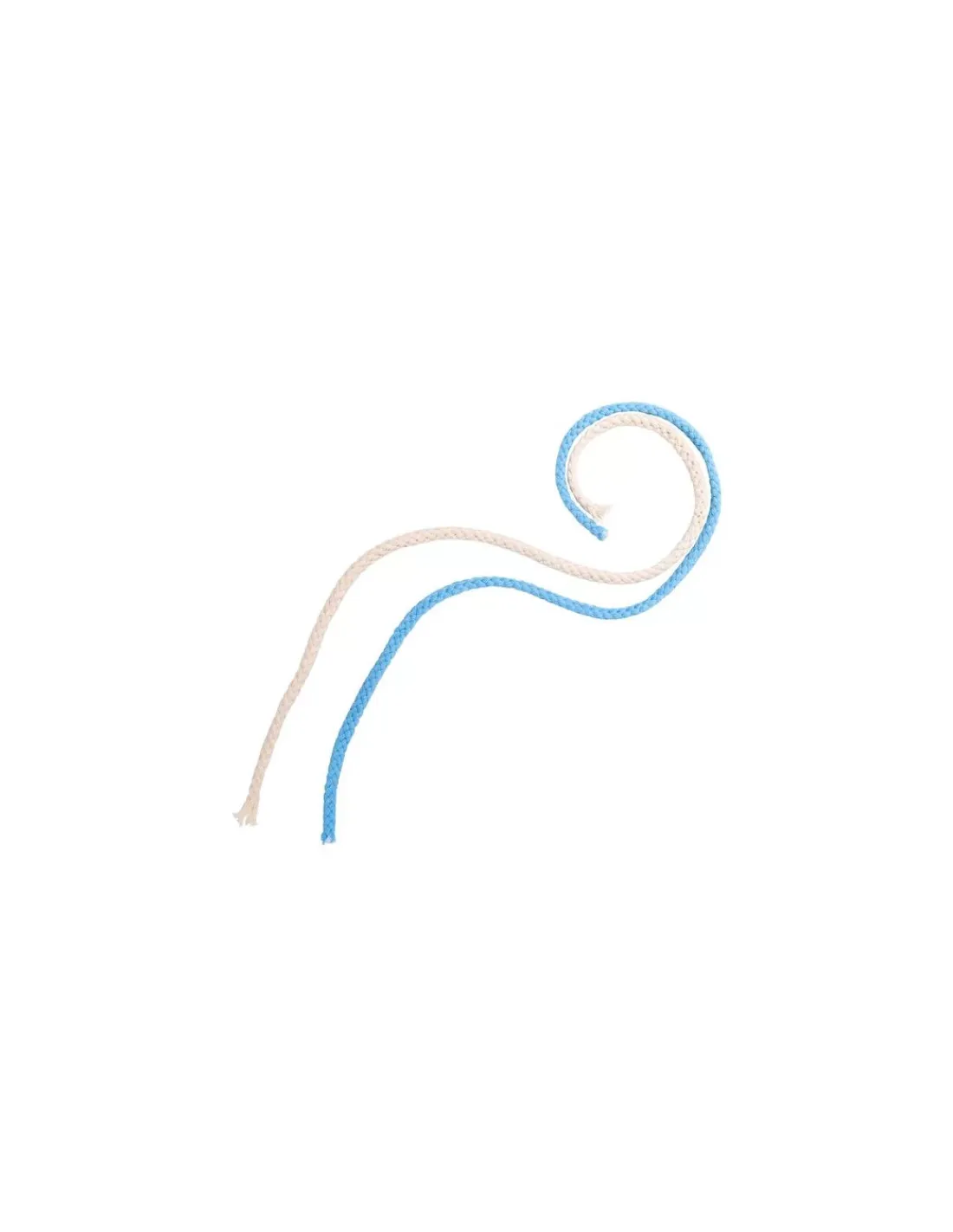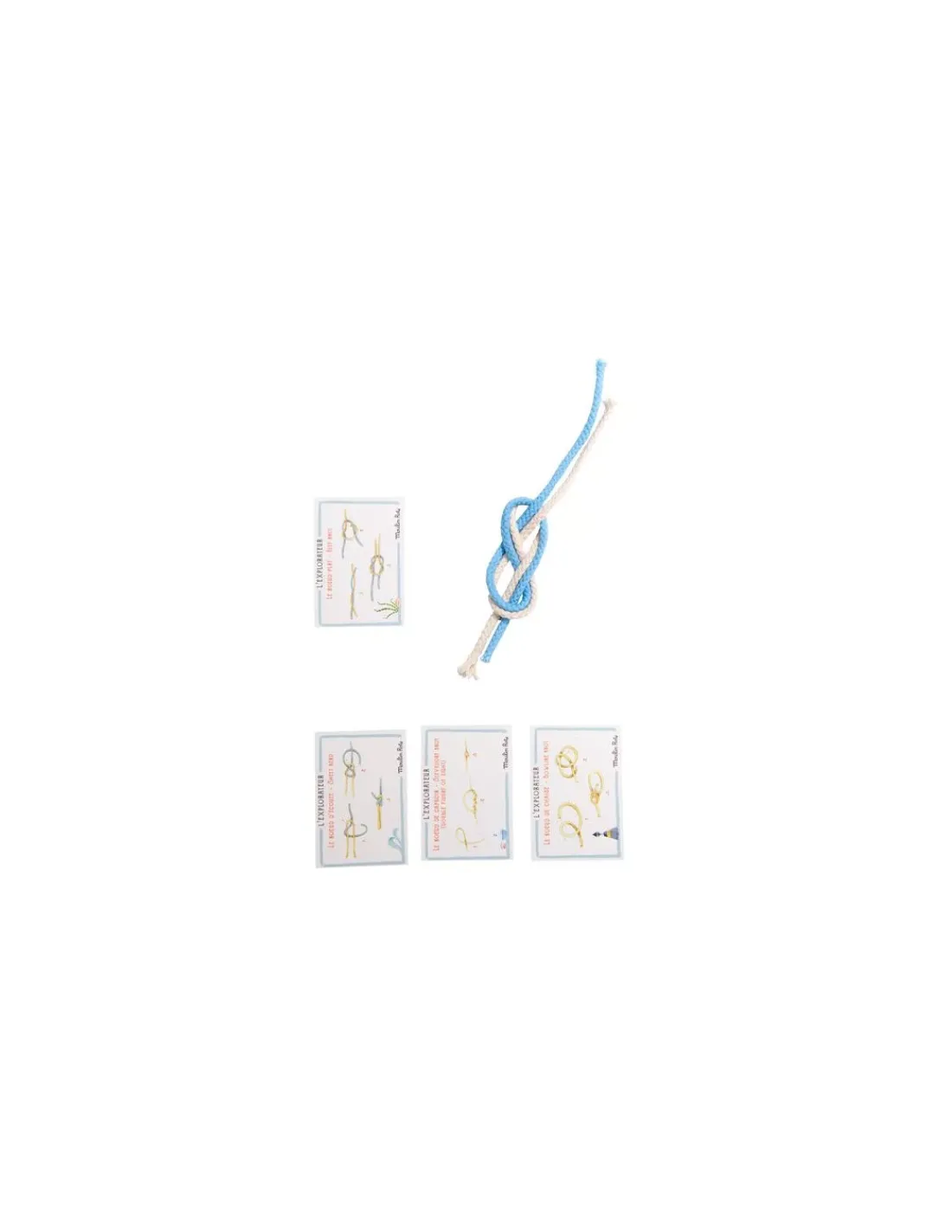 Deux cordes de couleur naturel et bleue, présentées dans une jolie boîte comprenant quatre cartes imprimées recto-verso pour apprendre à réaliser facilement différents nœuds grâce aux tutoriels illustrés : nœud en huit, nœud plat… et bien d’autres.