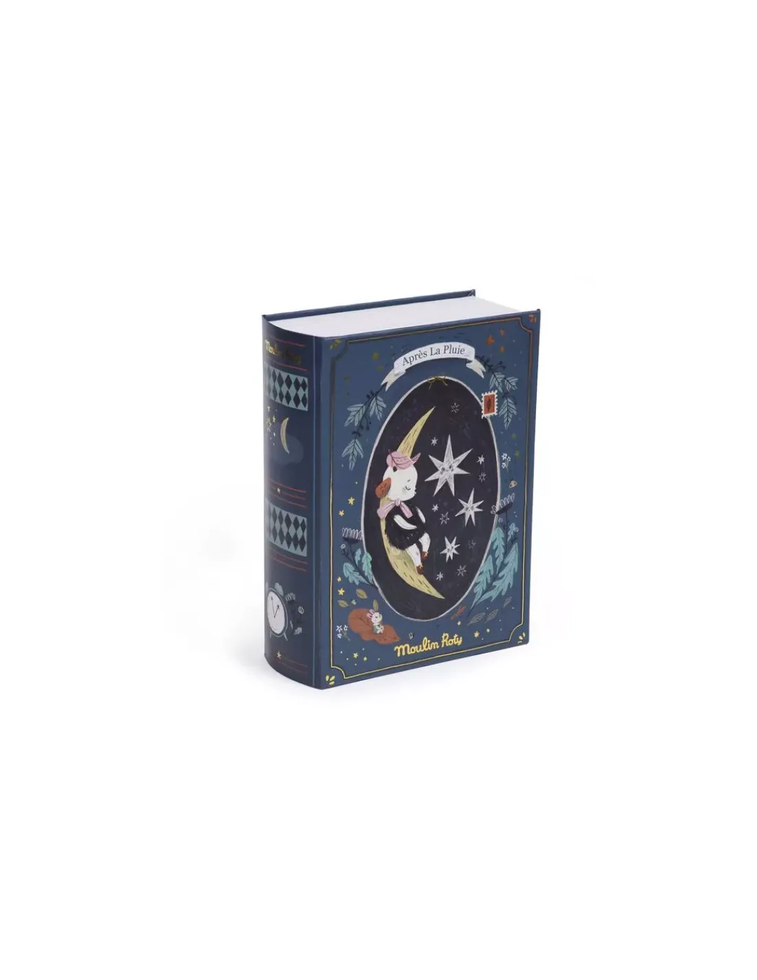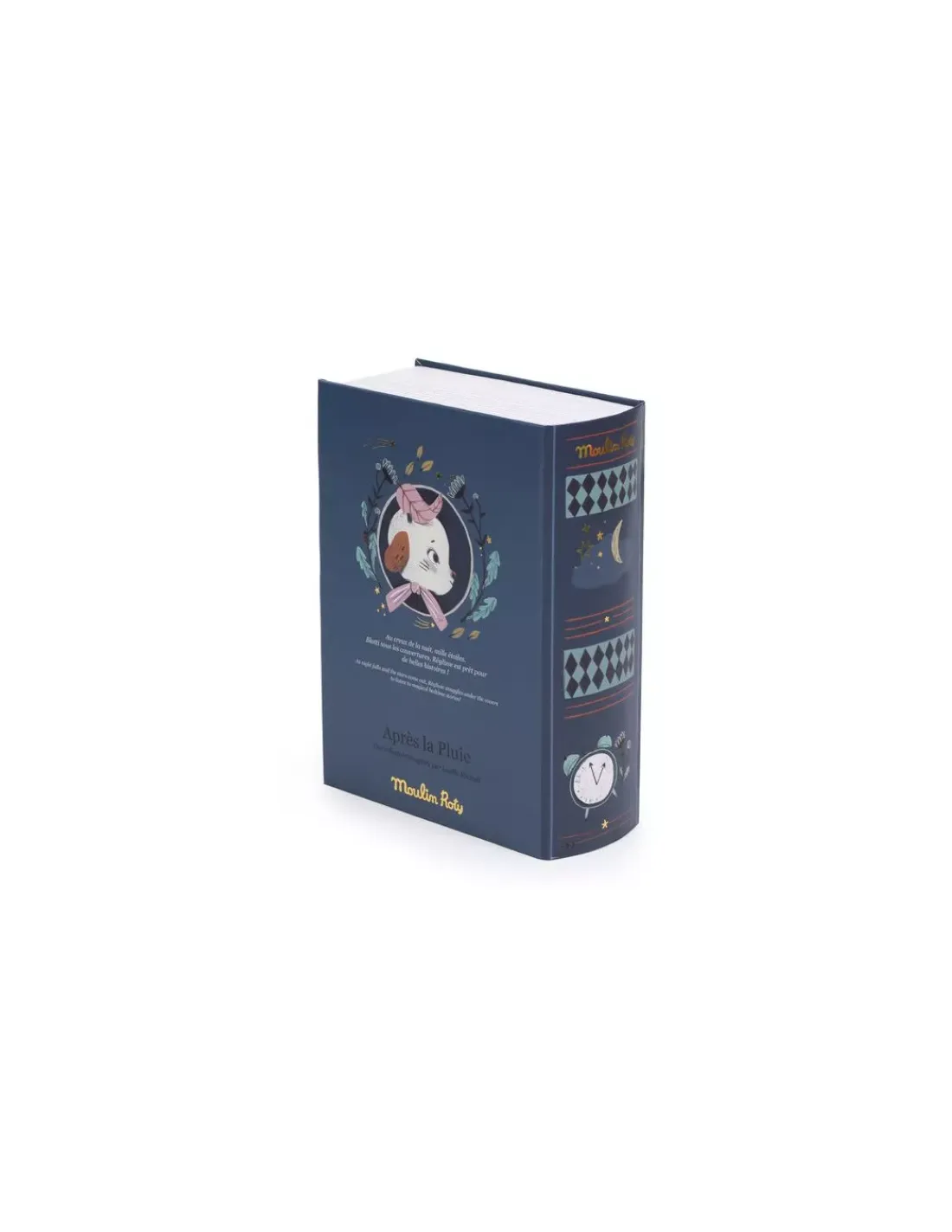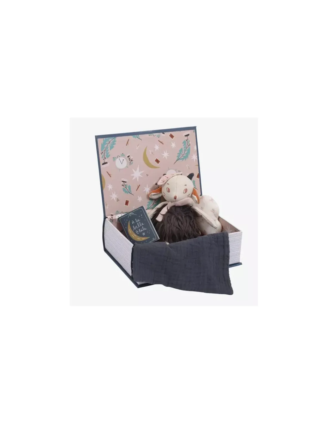 Découvrez le livre belle nuit de la collection Après la pluie de Moulin Roty, un cadeau de naissance élégant et mignon à la fois. Dans son livre cachette, le mouton Réglisse en fourrure et tissu chambray est blotti sous sa couverture à pois, entre son matelas en lange et son coussin nuage. Il tient dans ses bras un mini-livre pour raconter de jolies histoires du soir.