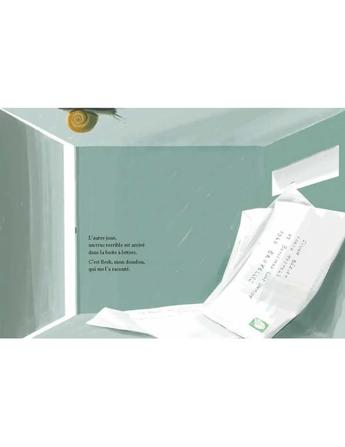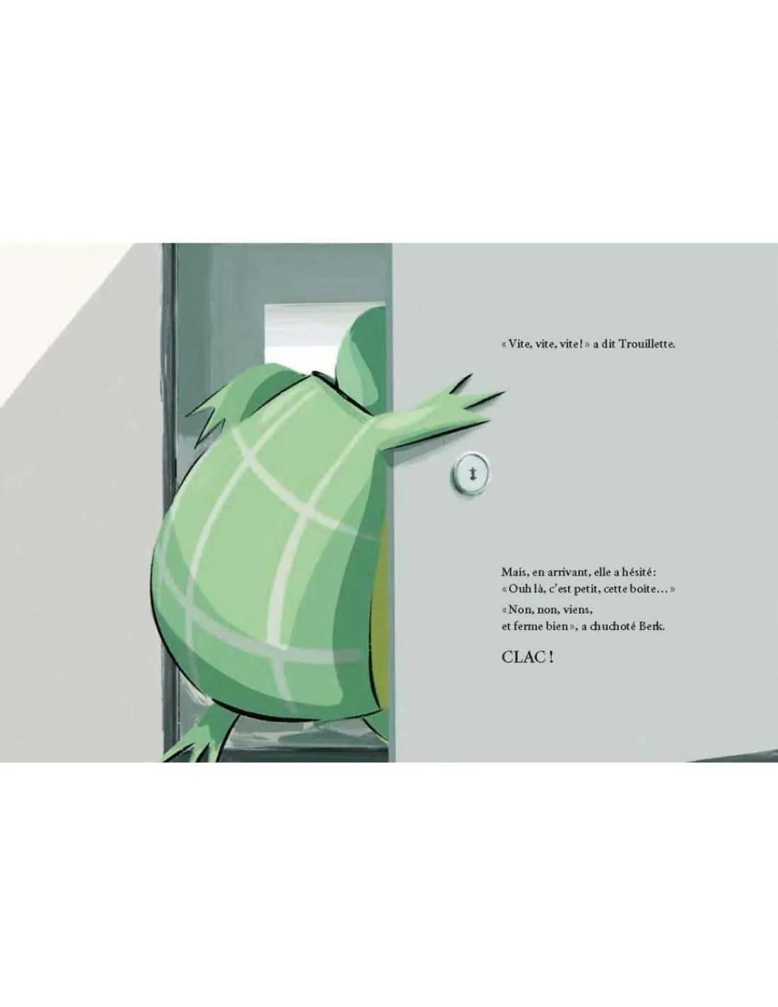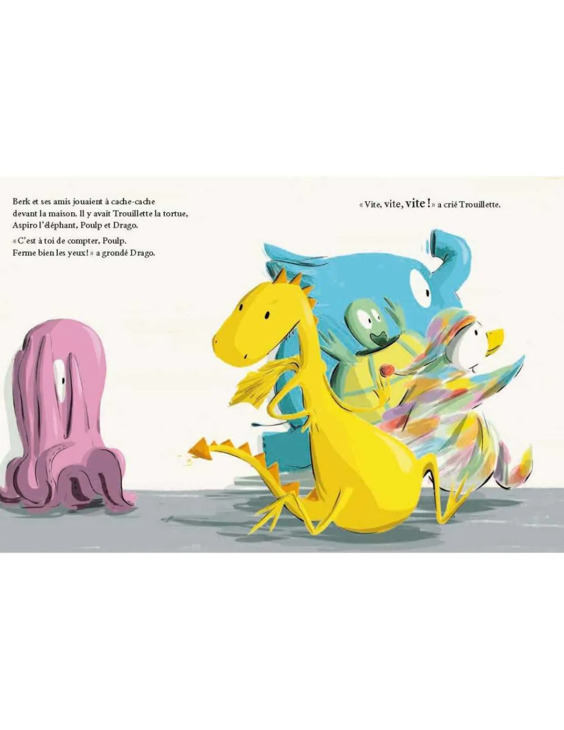 L’autre jour, un truc terrible est arrivé. Berk et ses amis jouaient à cache-cache devant la maison. Super fier de son idée, Berk s’est faufilé dans la boîte à lettres. Trouillette l’a rejoint. Mais bizarrement, il n’y avait plus aucun bruit dehors. Et impossible de ressortir de la boîte. Trouillette s’est lamentée : si les copains les avaient oubliés ?