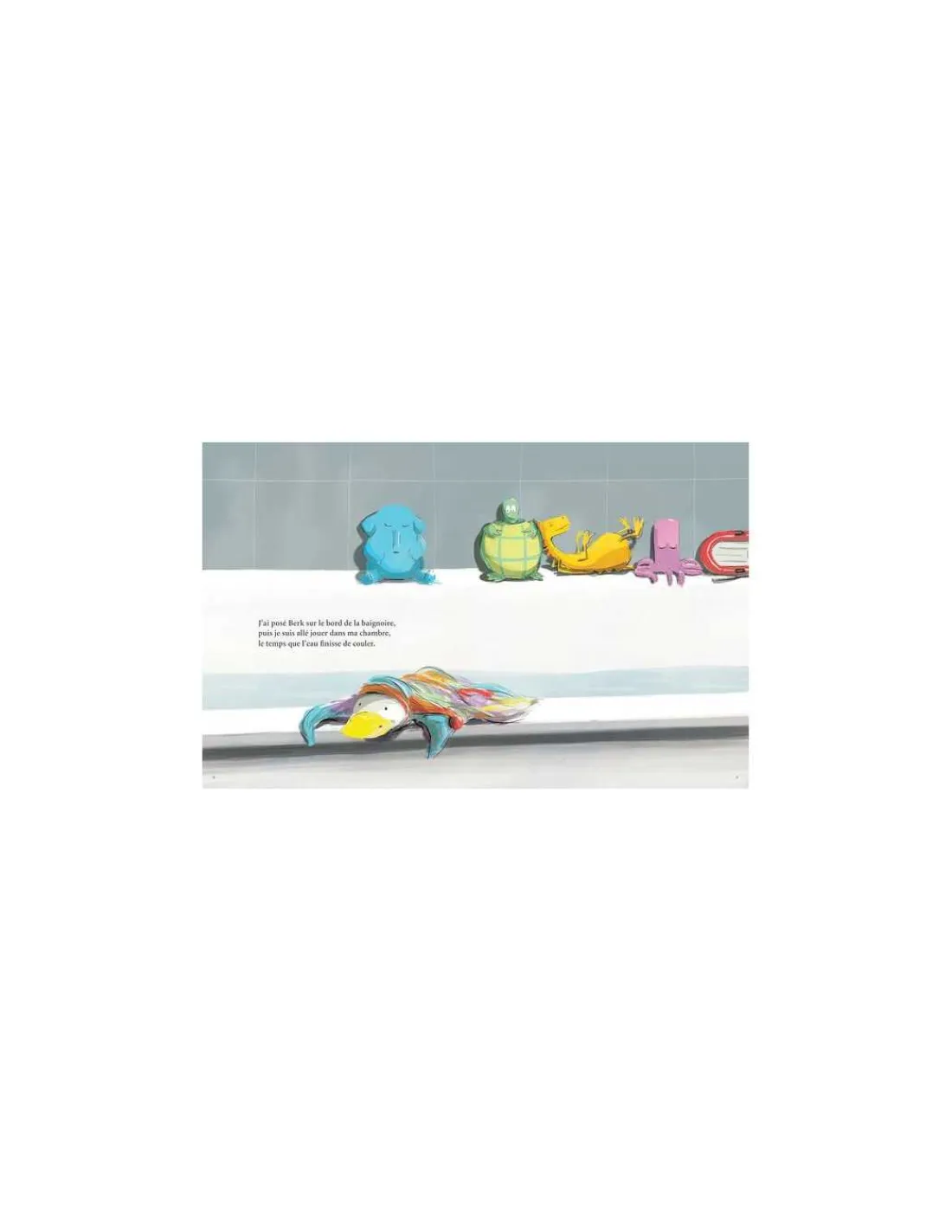 L’autre jour un truc terrible est arrivé dans mon bain. J’ai posé Berk sur le bord de la baignoire et je suis allé jouer dans ma chambre, le temps que l’eau finisse de couler. Le problème, c’est qu’il a glissé, et PLOUF ! Trouillette ma tortue a paniqué : « Berk se noie ! ». Drago, Poulp et Aspiro étaient prêts à tout pour l’aider mais qu’est-ce que le doudou-chouchou essayait de leur dire, la bouche remplie d’eau ?