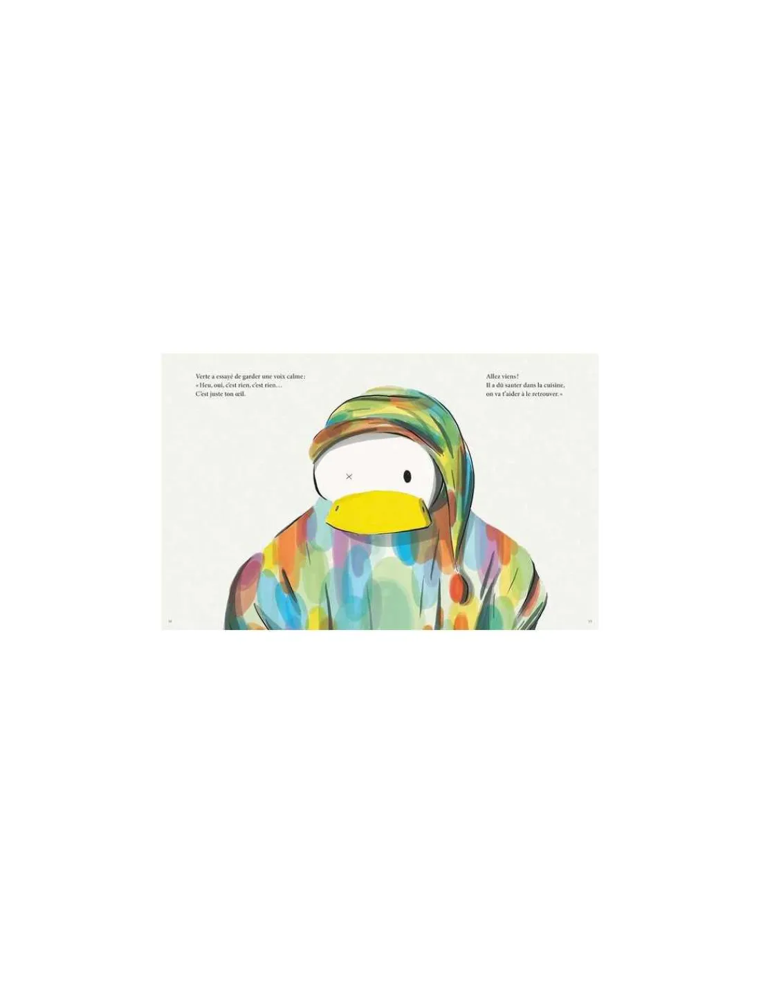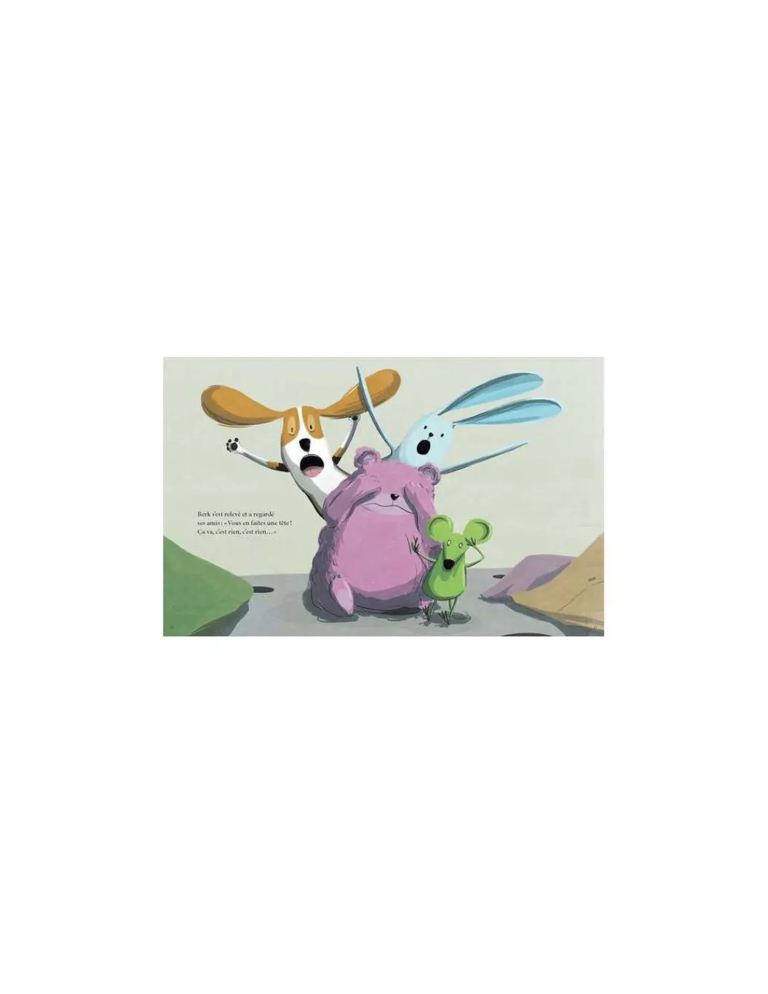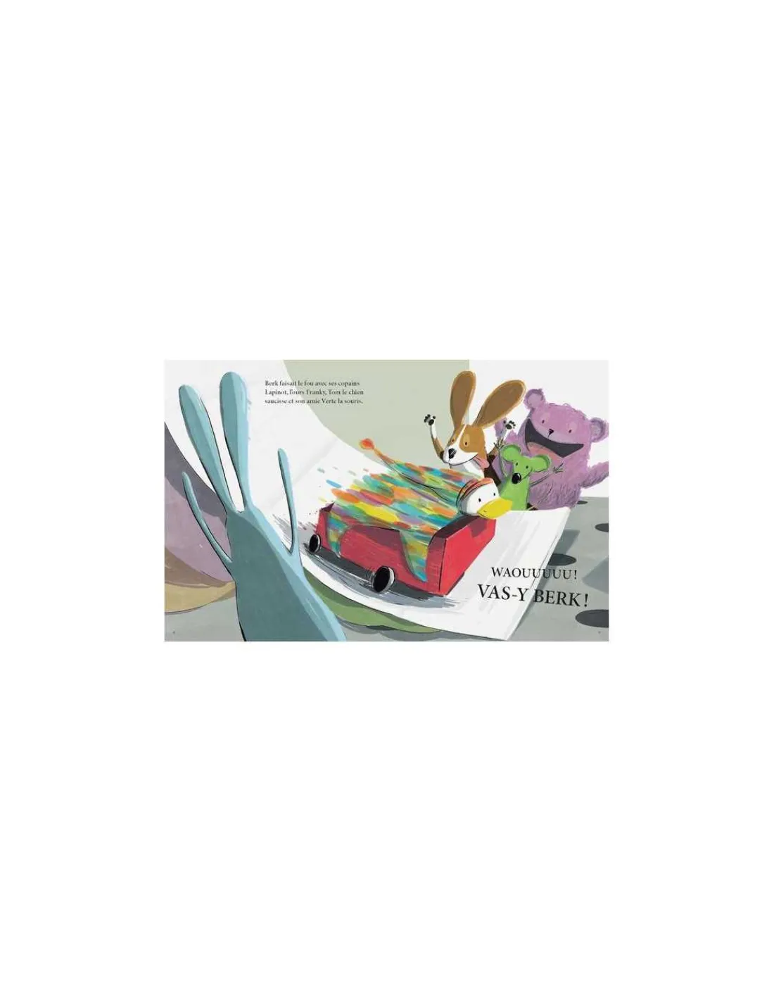 L’autre jour, un truc terrible est arrivé dans ma cuisine. C’est Berk, mon canard, qui me l’a raconté. Berk faisait le fou avec ses copains Lapinot, l’ours Franky, Tom le chien saucisse, et son amie Verte la souris. Quand soudain… PAF! TCHAK! OUCH! Berk s’est relevé et a regardé ses amis : « Vous en faites une tête! » C’est rien, juste l’œil de Berk qui a sauté dans la cuisine.