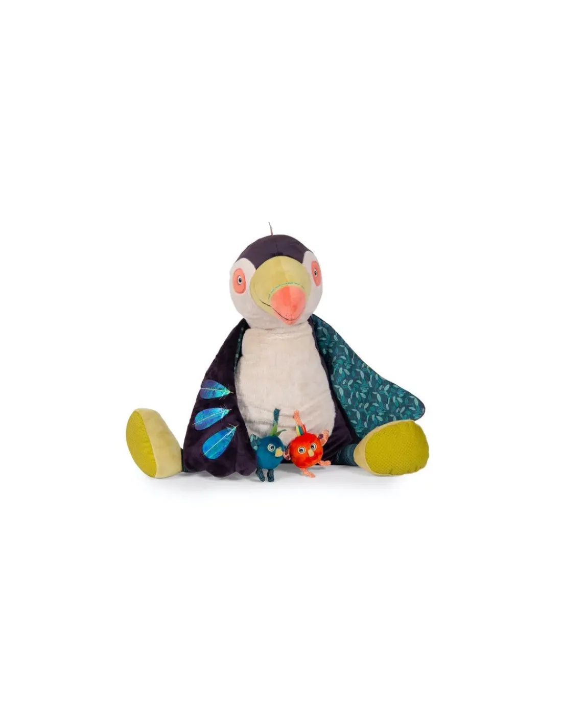 Ce toucan aux grandes ailes offre un mélange de textures et de couleurs pour le plus grand bonheur de vos enfants : tissu texturé aux pattes, plumes en tissu holographique, papier crissant dans la queue… Cachés dans son ventre, on entend deux petits poussins… « cui-cui », « pouët »!
