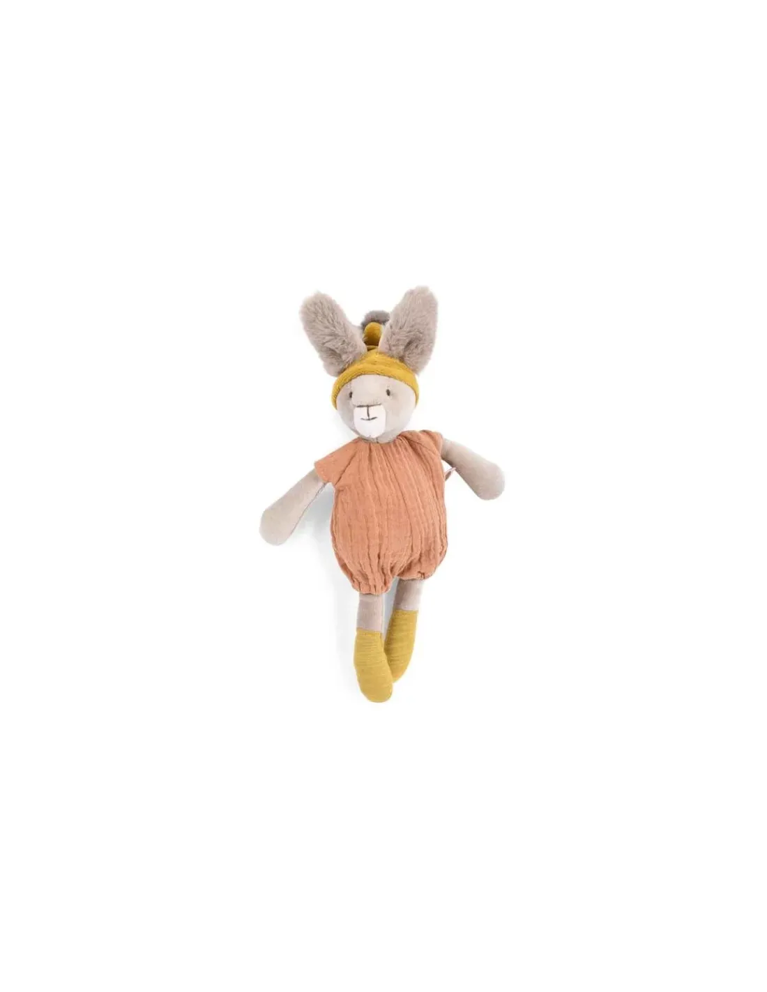 Découvrez le petit lapin argile de la collection Trois Petits Lapins de Moulin Roty, un doudou de 30 cm avec de longues pattes et de longues oreilles à attraper pour de tendres instants câlins.
