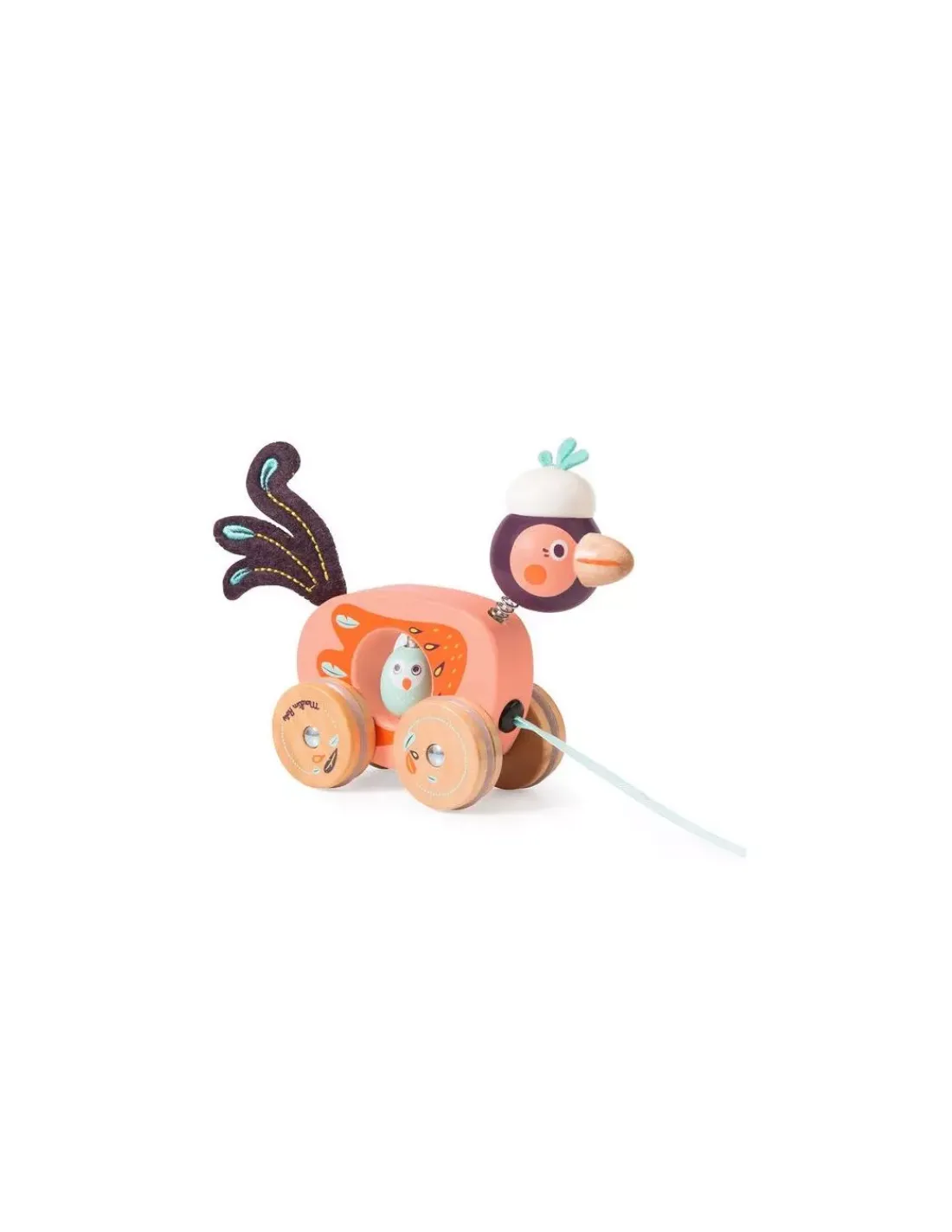 Votre enfant s’amusera à tirer sur le ruban pour promener Paloma l’oiseau. Le jouet repose sur 4 roues et sa tête est fixée sur un ressort, elle s’agite quand l’oiseau avance.