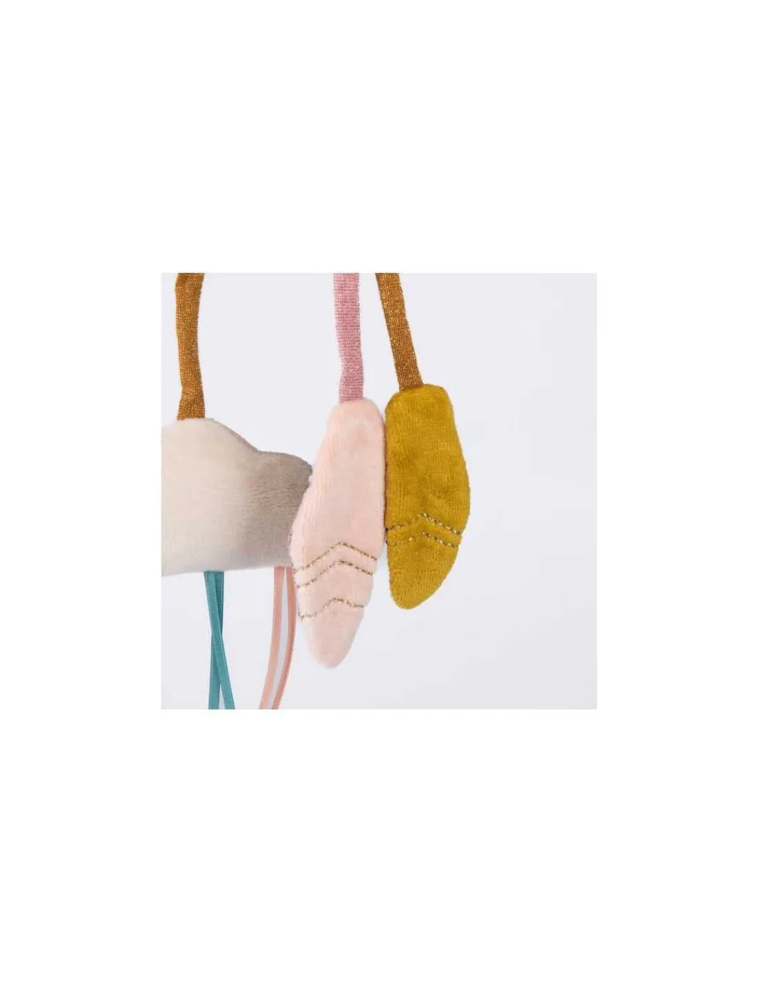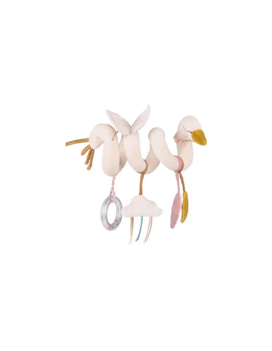 Une spirale d’activités cygne qui promet à bébé de jolies découvertes avec plusieurs activités et textures : pouët dans le nuage, papier froissé dans les ailes, nouettes à tirer, anneau à billes…