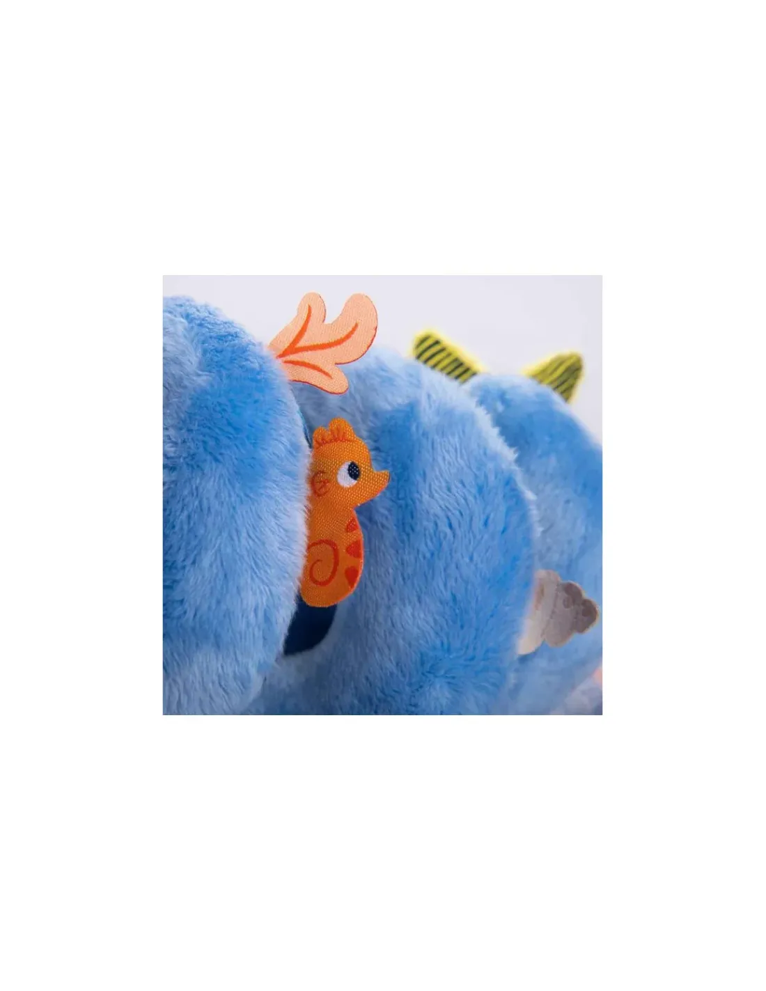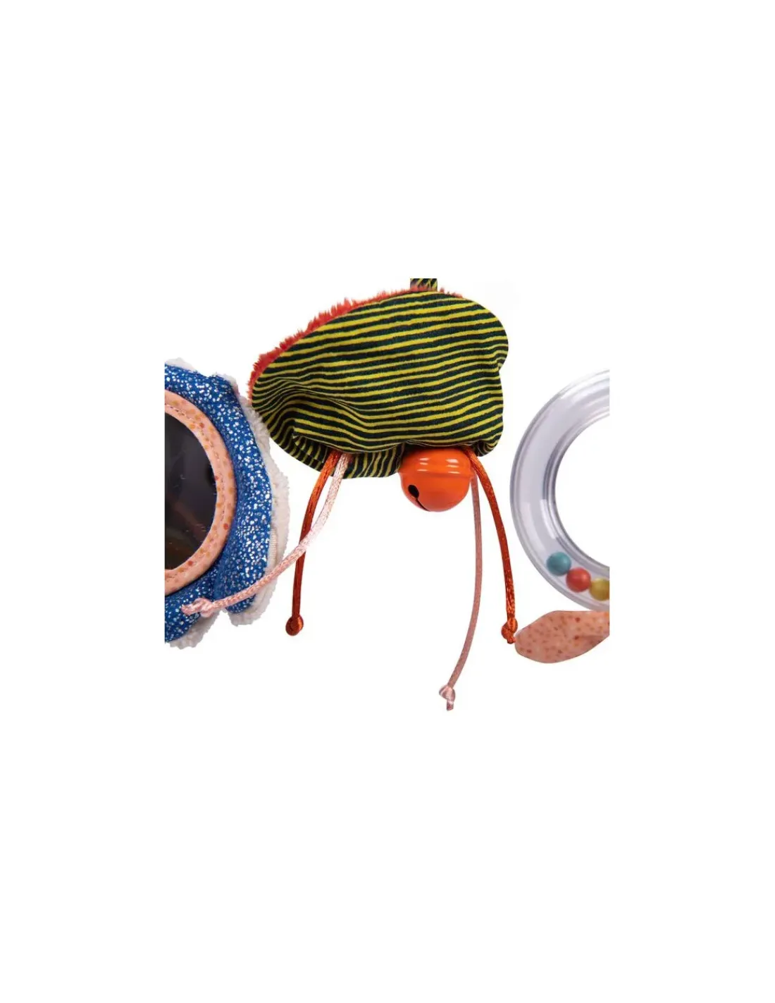 Une spirale marine toute douce, décorée d’animaux, de coquillages et plantes marines, qui invite bébé à jouer sous l’océan : miroir, anneau à billes, étiquettes à saisir ou mâchouiller.