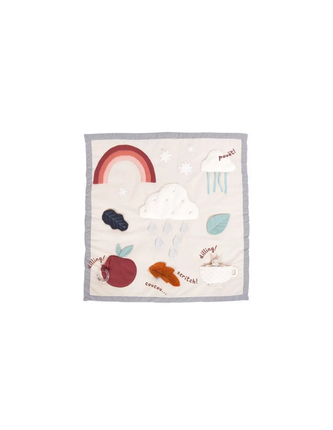 Découvrez le tapis d’éveil de la collection Après la pluie de Moulin Roty, un magnifique tapis molletonné en tissu chambray avec de nombreuses activités aux couleurs d’automne. Des feuilles qui font scritch-scritch, un lapin à grelot dans sa tasse de thé, un anneau à billes caché dans la pomme et plein de matières à découvrir avec la météo.