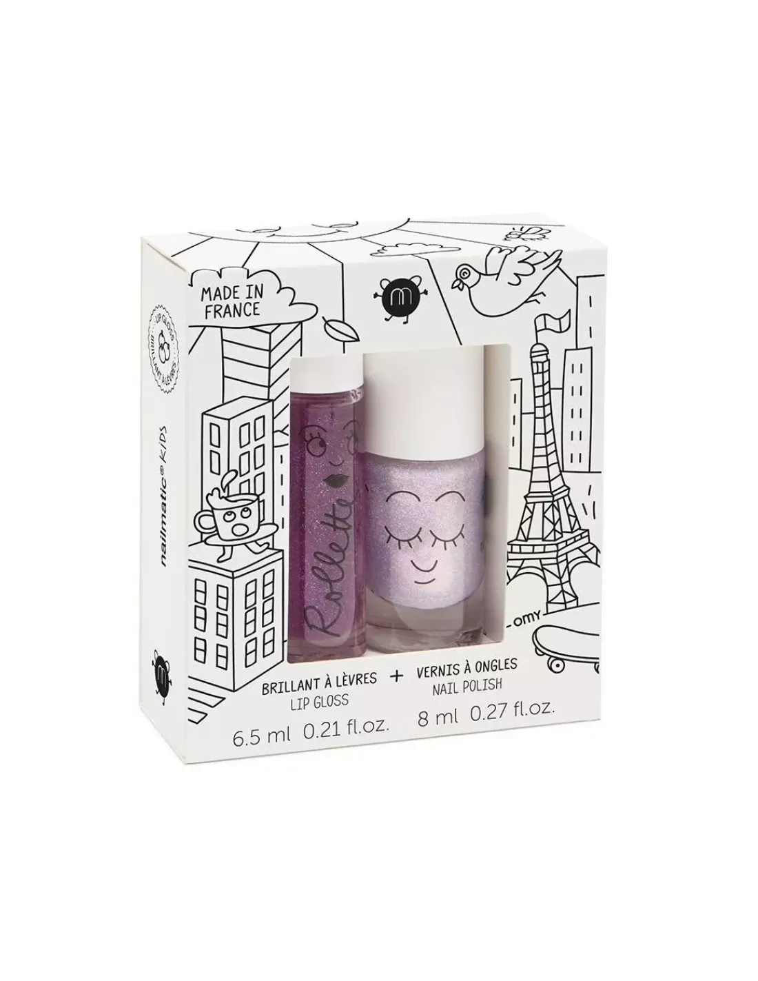 Découvrez le coffret LOVELY CITY de nailmatic KIDS, un coffret comprenant un vernis à l’eau et un soin gourmand pour les lèvres spécialement conçu pour les enfants. Ce coffret cadeau comprend un vernis Eliott de couleur rose nacré et un brillant à lèvres au parfum naturel de mûre.