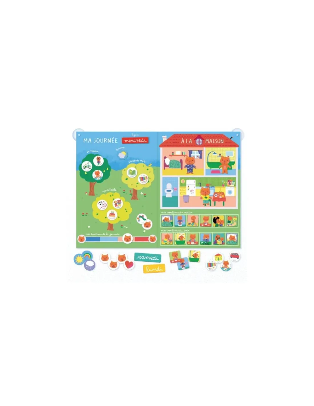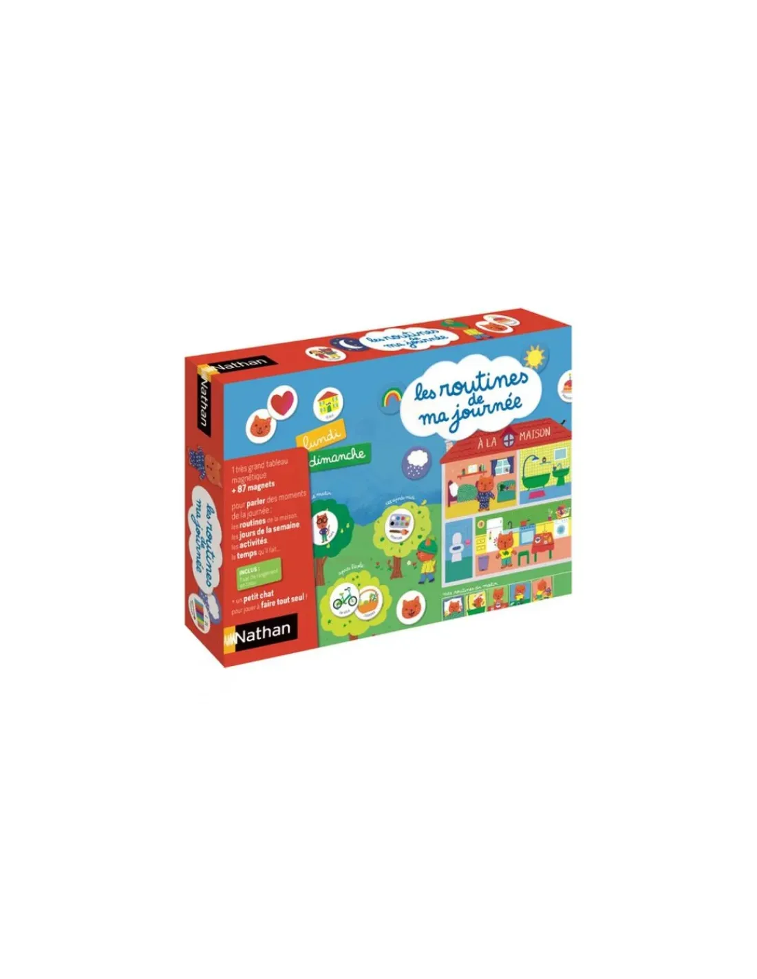 Découvrez le calendrier Les routines de ma journée de Nathan, un très grand tableau magnétique et 87 magnets pour parler des moments de la journée, des routines de la maison, des jours de la semaine, des activités, du temps qu’il fait.