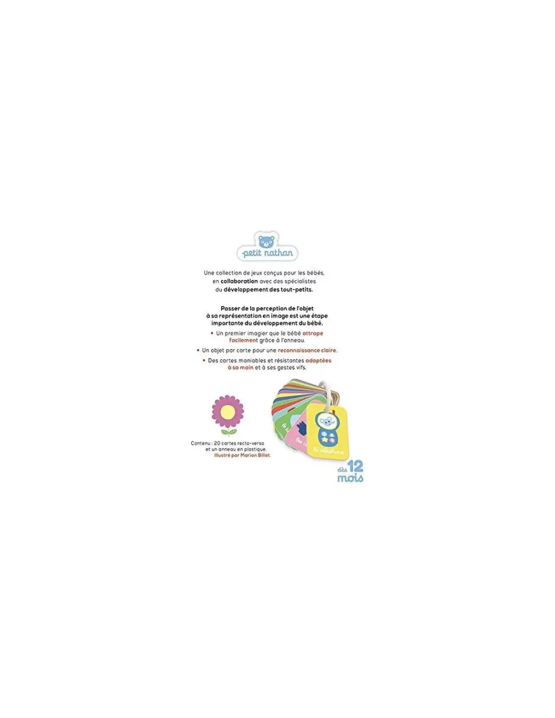 Passer de la perception de l’objet à sa représentation en image est une étape importante du développement de l’enfant. Un premier imagier que votre enfant attrape facilement grâce à l’anneau. Un objet par carte pour une reconnaissance claire avec des cartes maniables et résistantes adaptées à sa petite main et à ses gestes vifs.