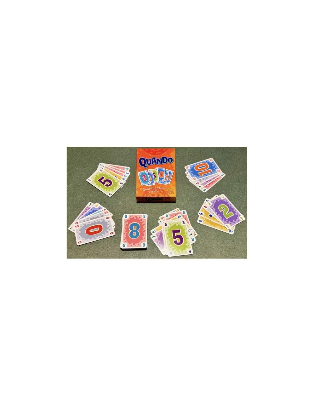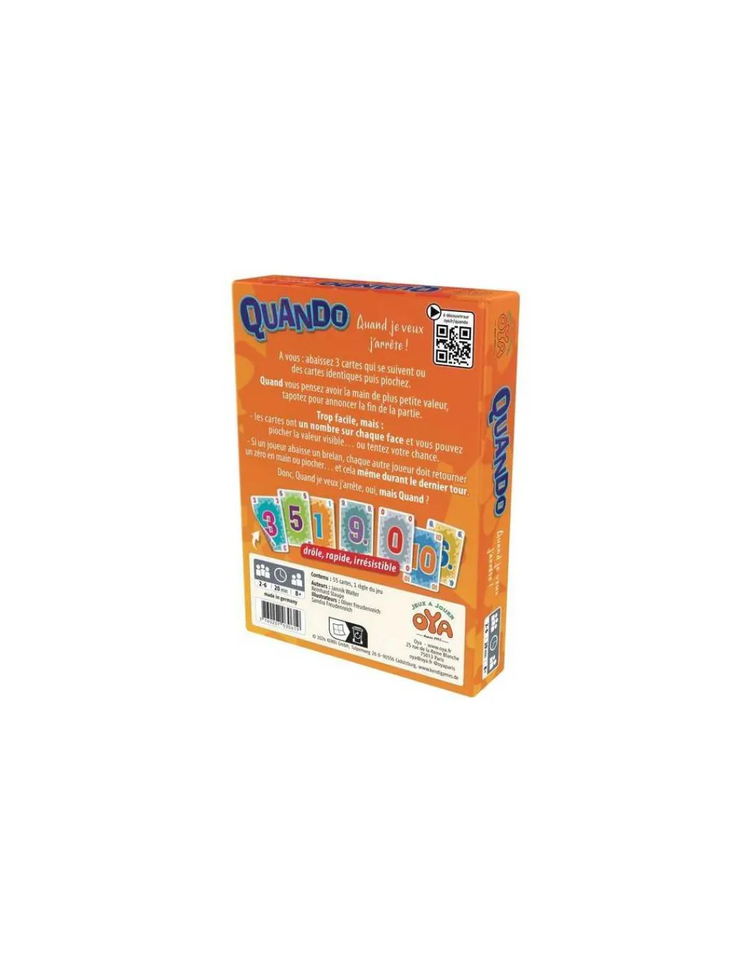Découvrez le jeu Quando de Oya, un jeu de cartes pour jouer de 2 à 6 joueurs, à partir de 8 ans. Un jeu de stop ou encore simple et rapide, dans lequel vous devrez vous défausser de vos cartes pour avoir la plus petite valeur.