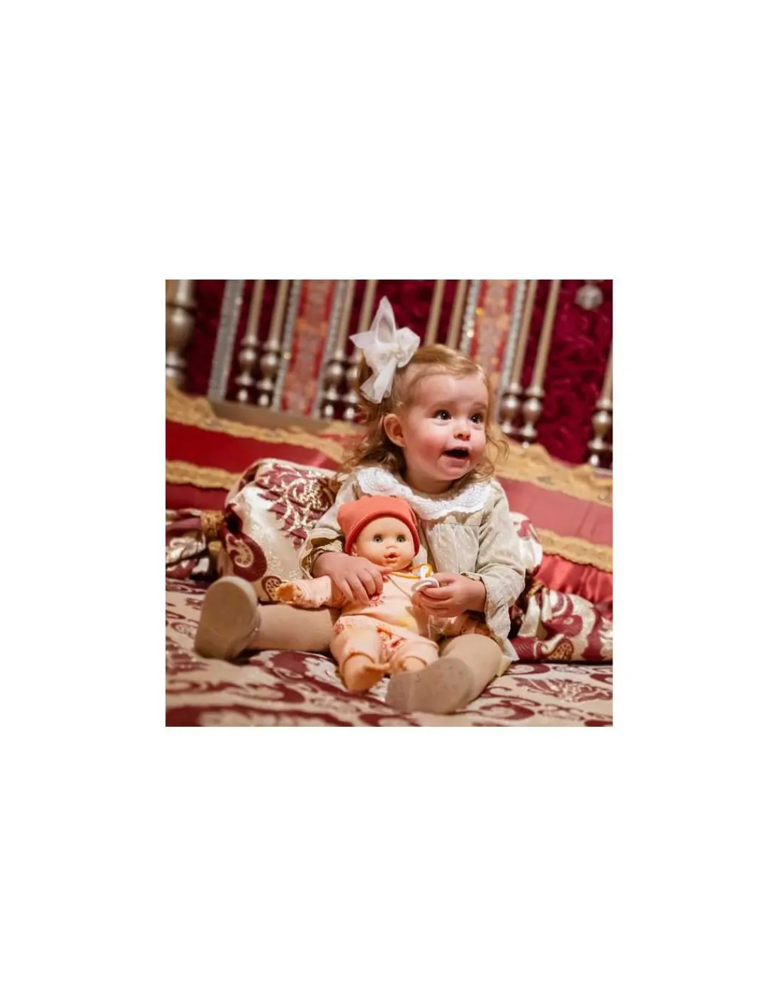 Une poupée au corps souple avec les membres et la tête en vinyle à la douce senteur de vanille sans cheveux. Une poupée non sexuée qui pleure lorsqu’elle n’a pas sa tétine et qui dit papa et maman. Une poupée idéale pour jouer au papa et à la maman qu’il faudra câliner.
