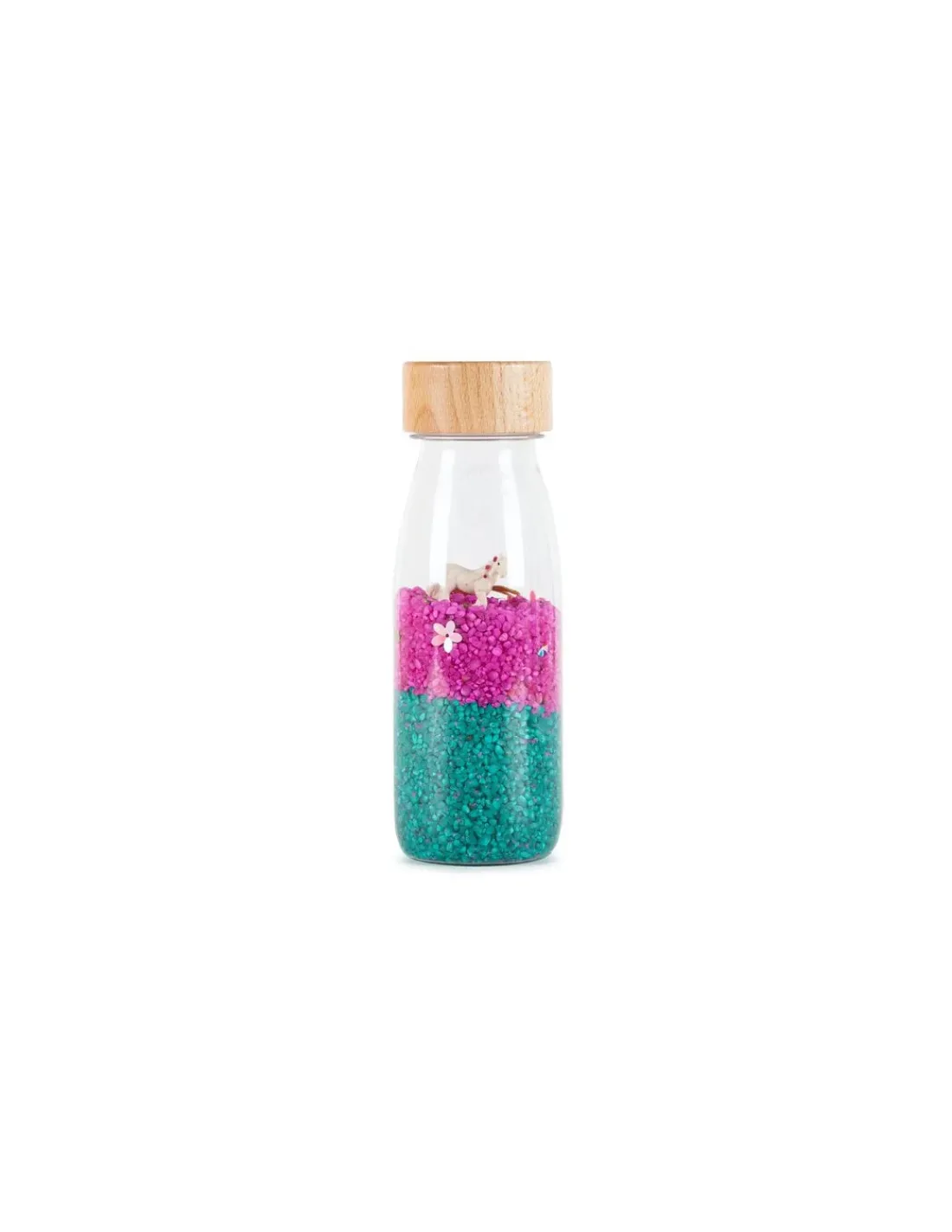 Découvrez les 3 bouteilles sensorielles Fantasy de Petit Boum, une activité d’éveil avec 3 bouteilles pour regarder, agiter et écouter, pour s’éveiller à partir de 3 mois. Une bouteille flottante turquoise, une bouteille sonore sirène et une bouteille sonore licorne. Des bouteilles pour stimuler l’ouïe, la vue et le toucher. Votre enfant va s’amuser à observer les éléments, agiter les bouteilles et découvrir des sons, empiler les bouteilles, les faire rouler…