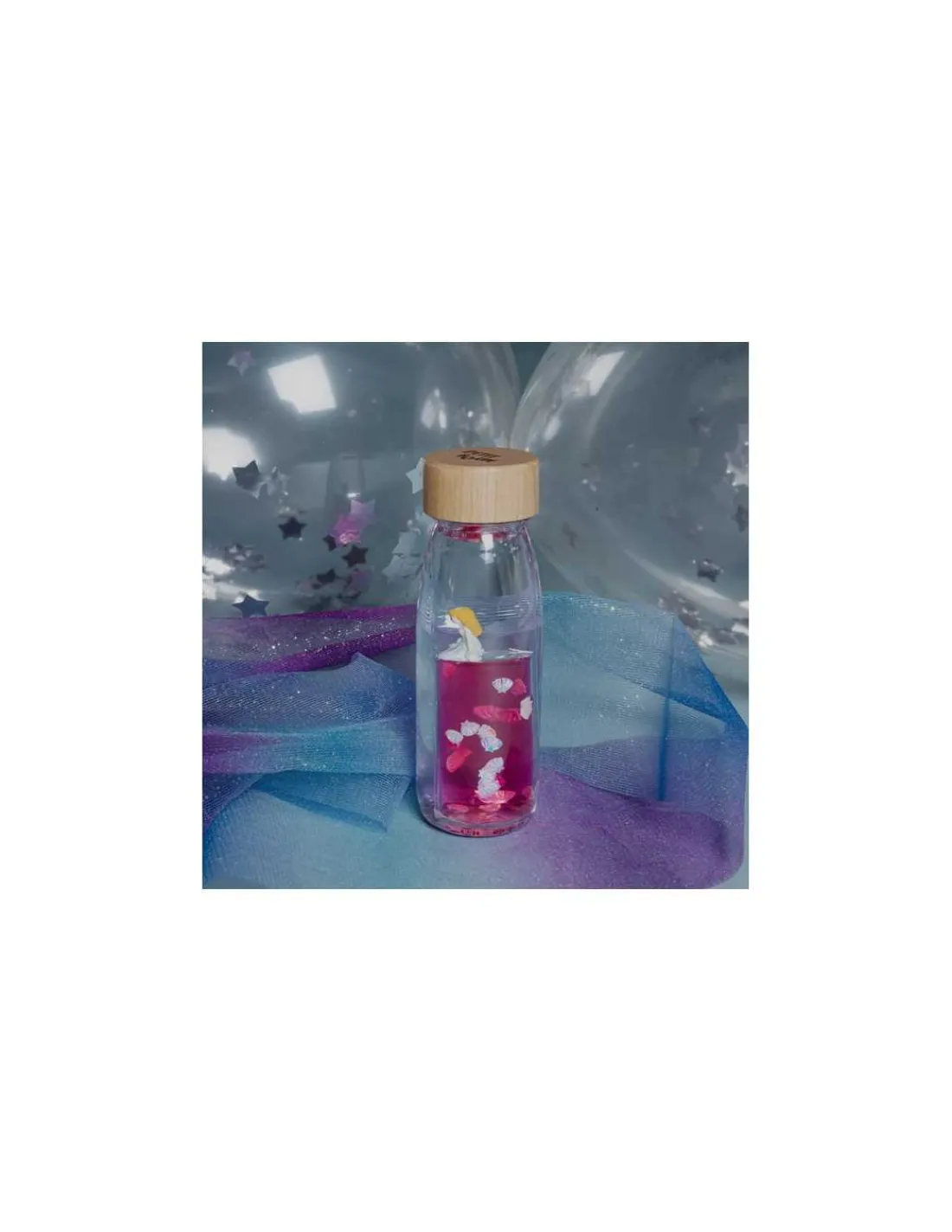 Découvrez la bouteille sensorielle Move Étincelle de mer de Petit Boum, une bouteille flottante révolutionnaire avec une double paroi offrant un effet loupe, idéal pour observer une sirène, des coquillages, des perles, des paillettes scintillantes… Une jolie bouteille sensorielle contenant du liquide rose, que votre enfant va s’amuser à secouer et à faire rouler.